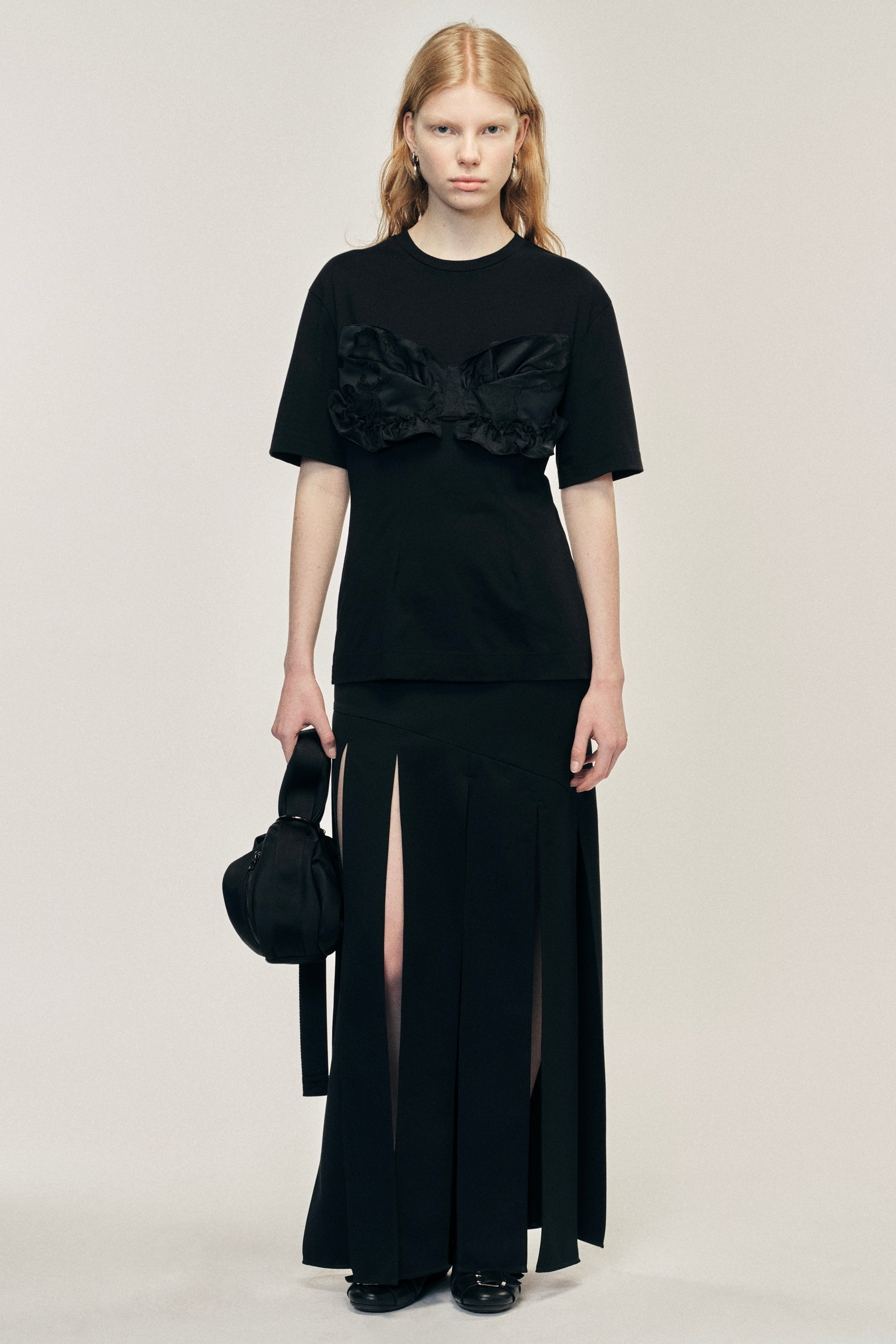 A relaxed t-shirt with a tonal floral brocade patchwork detail at the bust. The contrast of the ornate fabric elevates this easy style. The model is wearing this style with the Bias Cut Multi Slit Skirt. Product Details Cotton jersey patchwork t-shirt - Contrasting bust detail - Relaxed fit Composition: Self: 100% Cotton Self 2: 100% Polyester SKU: 5358 0553 BLACK/BLACK Size & Fit Model is wearing size Small.