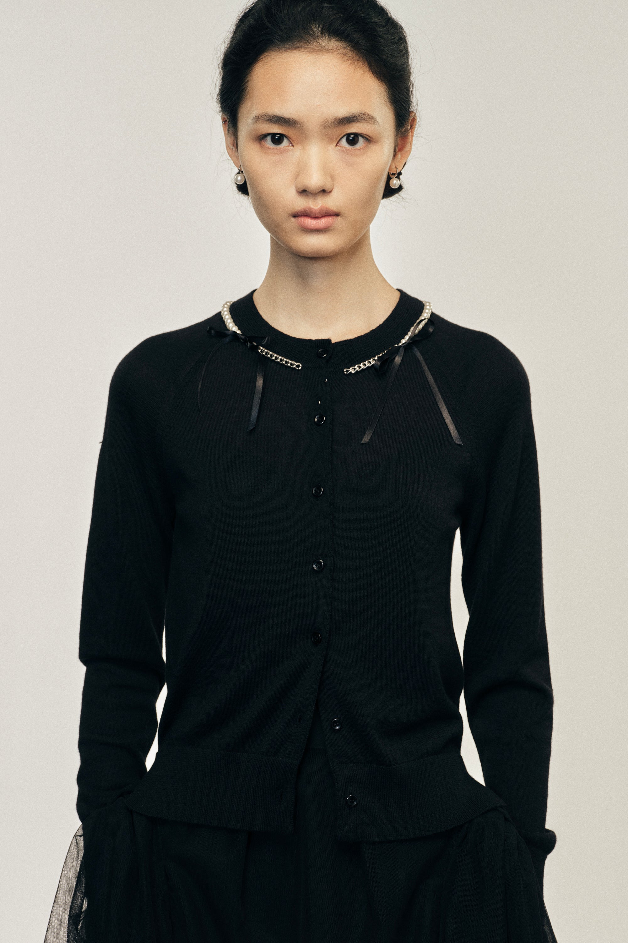 The signature cardigan is updated with seasonal pearl and chain strands embellished along the neckline. It can be easily paired with a slip dress or tutu skirt. The model is wearing this style with the Sheer Bow Hip Tutu Skirt. Product Details Merino wool and silk blend cardigan - Seasonal pearl and chain embellishment - Front button placket - Slim fit Composition: 75% Merino Wool 25% Silk (Excluding Embellishment) SKU: KMK13B 0647 BLACK/PEARL Size & Fit Model is wearing size Small.