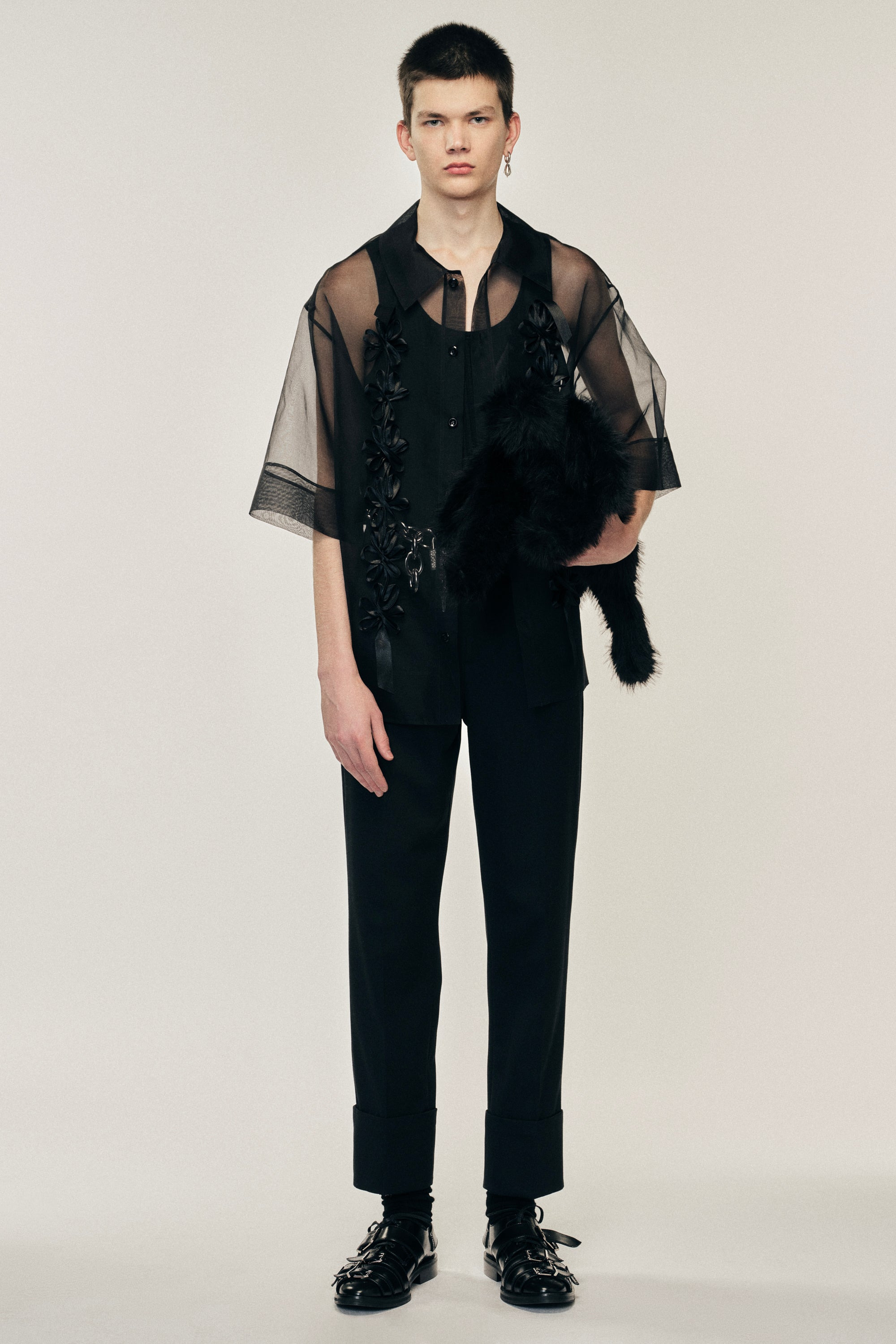 A striking sheer black organza button down shirt, the boxy cut gives the shirt an oversized fit. The front feature two vertical rows of ribbon appliques that create a flower-like motif. The model is wearing this style with the Ribbon Daisy Vest & Cuffed Straight Leg Trousers. Product Details Sheer silk organza button-up shirt - Ribbon applique at front - Open collar - Boxy fit Composition: 100% Silk Ribbon: 100% Polyester SKU: 5388 0360 BLACK/BLACK Size & Fit Model is wearing size Small.