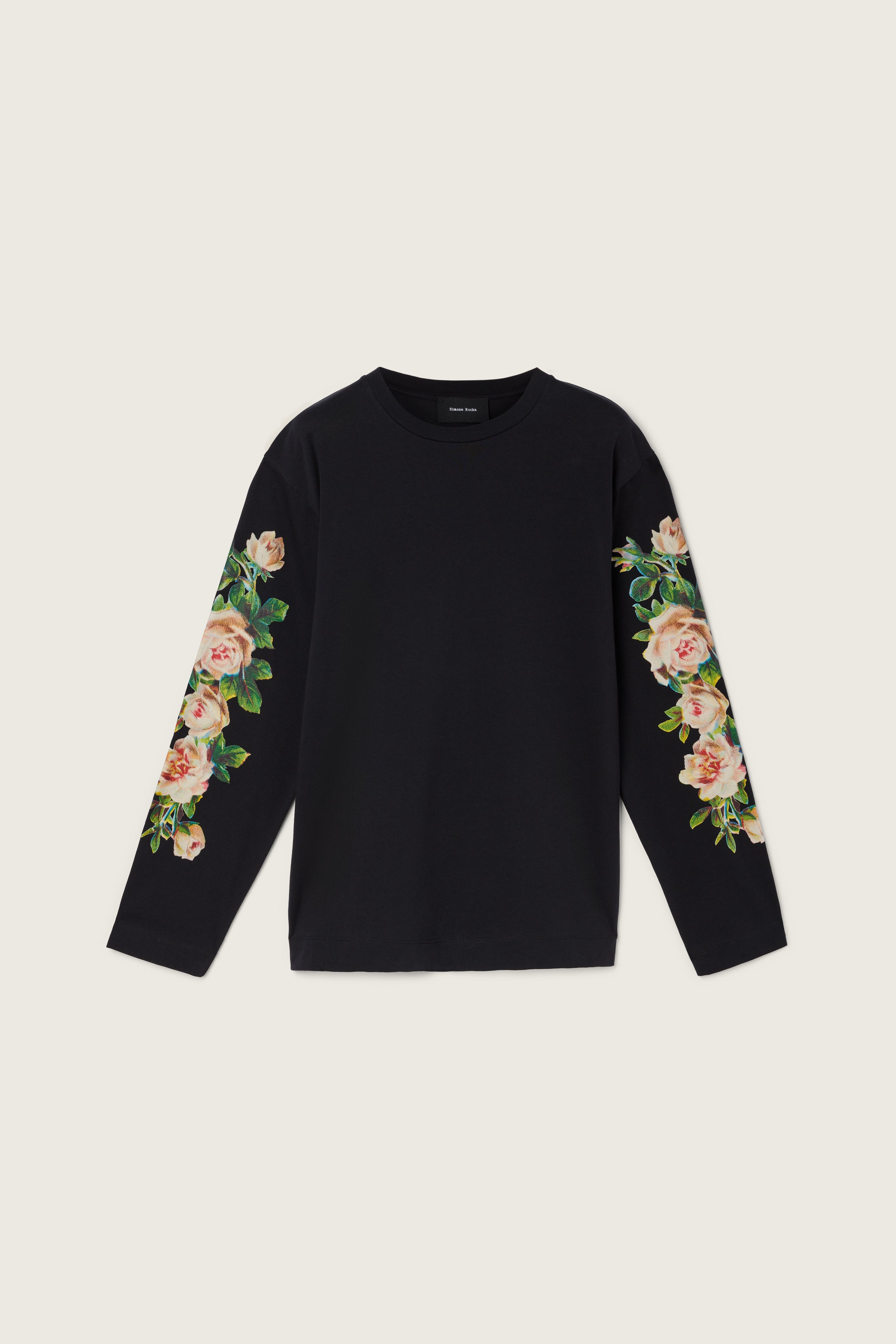 A long sleeve t-shirt featuring rose clusters along the sleeves in our classic unisex t-shirt fit. Product Details Cotton jersey long sleeve graphic t-shirt - Rose flower print on sleeves Composition: 100% Cotton SKU: 5194P52-M 0569 BLACK