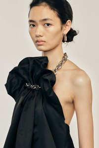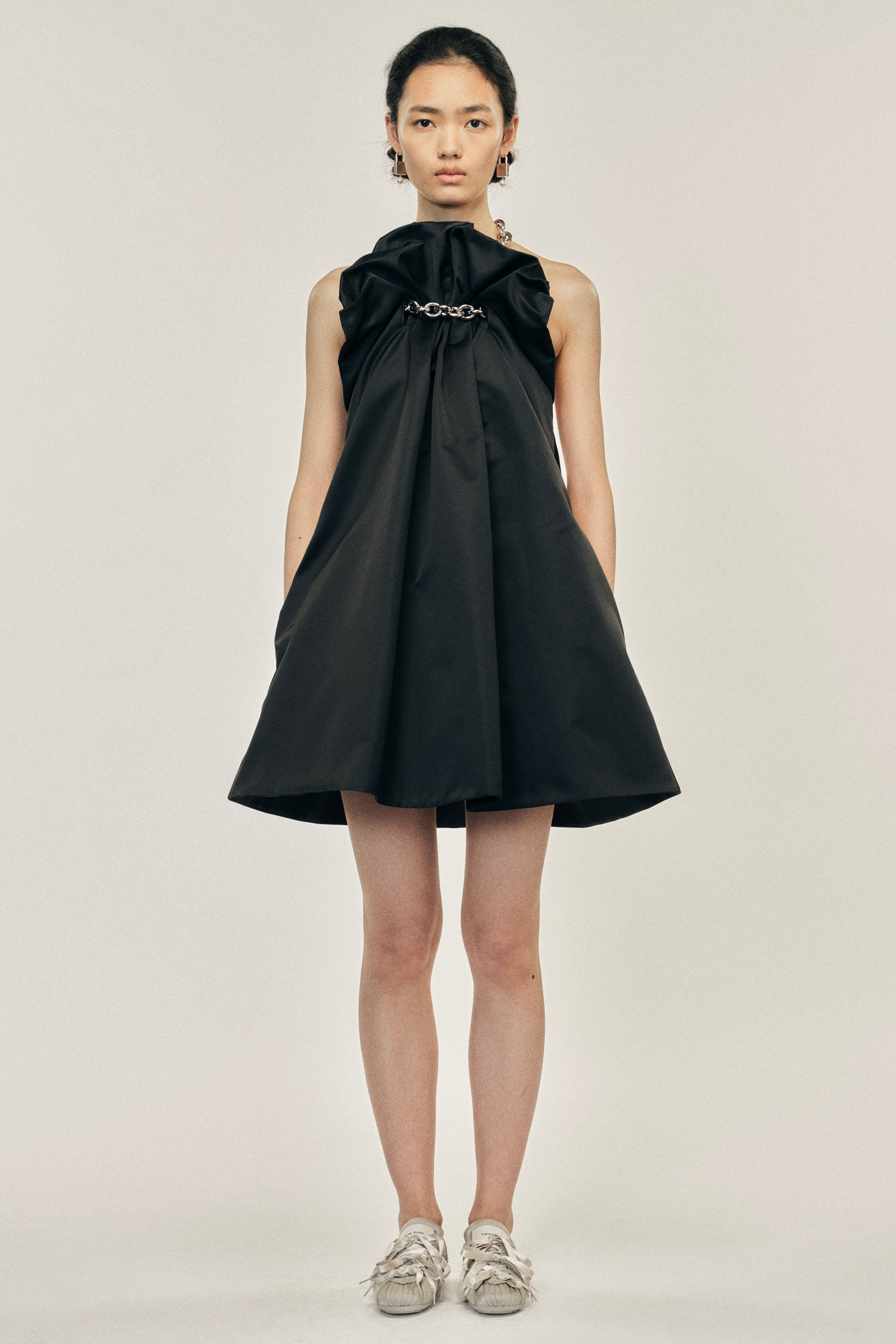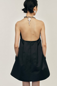 A voluminous mini dress constructed in a structural black duchess satin, it is held at the neck with a chain to have the illusion of the fabric floating. Product Details Duchess satin halterneck dress - From Look 36 on the runway - Seasonal chain detail - Gathering detail at front - Pockets at side - Zip closure Composition: 100% Polyester Lining: 60% Acetate 40% Cupro (Excluding Embellishment) SKU: 7427 1221 BLACK Size & Fit Model is wearing size 6.