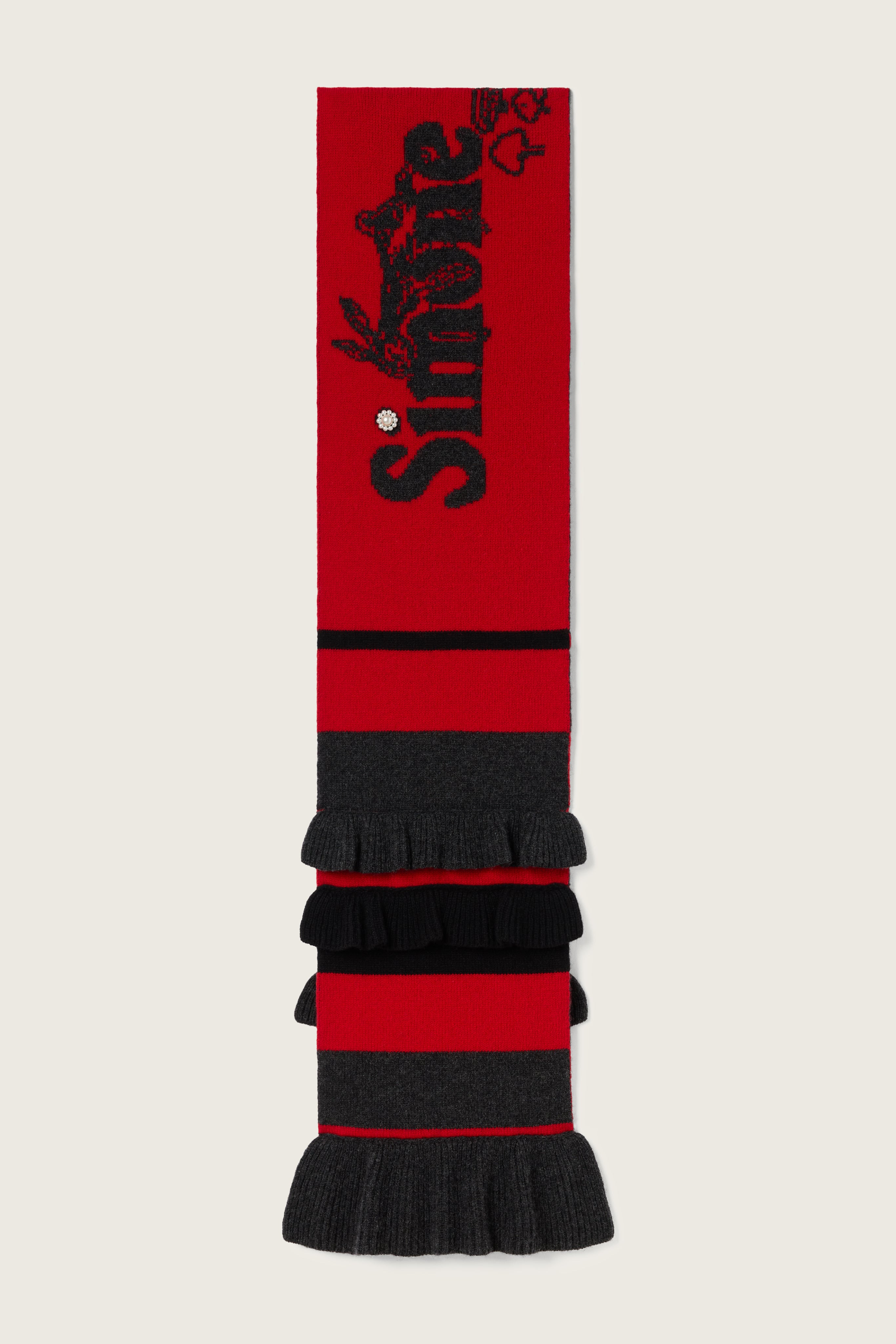 A merino wool and cashmere blend scarf featuring the Simone Rocha logo reinterpreted by artist Oscar Torrans. This multi-toned style also has the brand's signature ruffle detail throughout and a daisy embellishment. Product Details Merino and cashmere knit logo scarf - Signature daisy embellishment - Artwork by Oscar Torrans - Ruffle detail - 170cm x 21cm Composition: 90% Merino Wool 10% Cashmere (Excluding Embellishment) SKU: KIMK1WD 0669 CHARCOAL/RED/BLACK