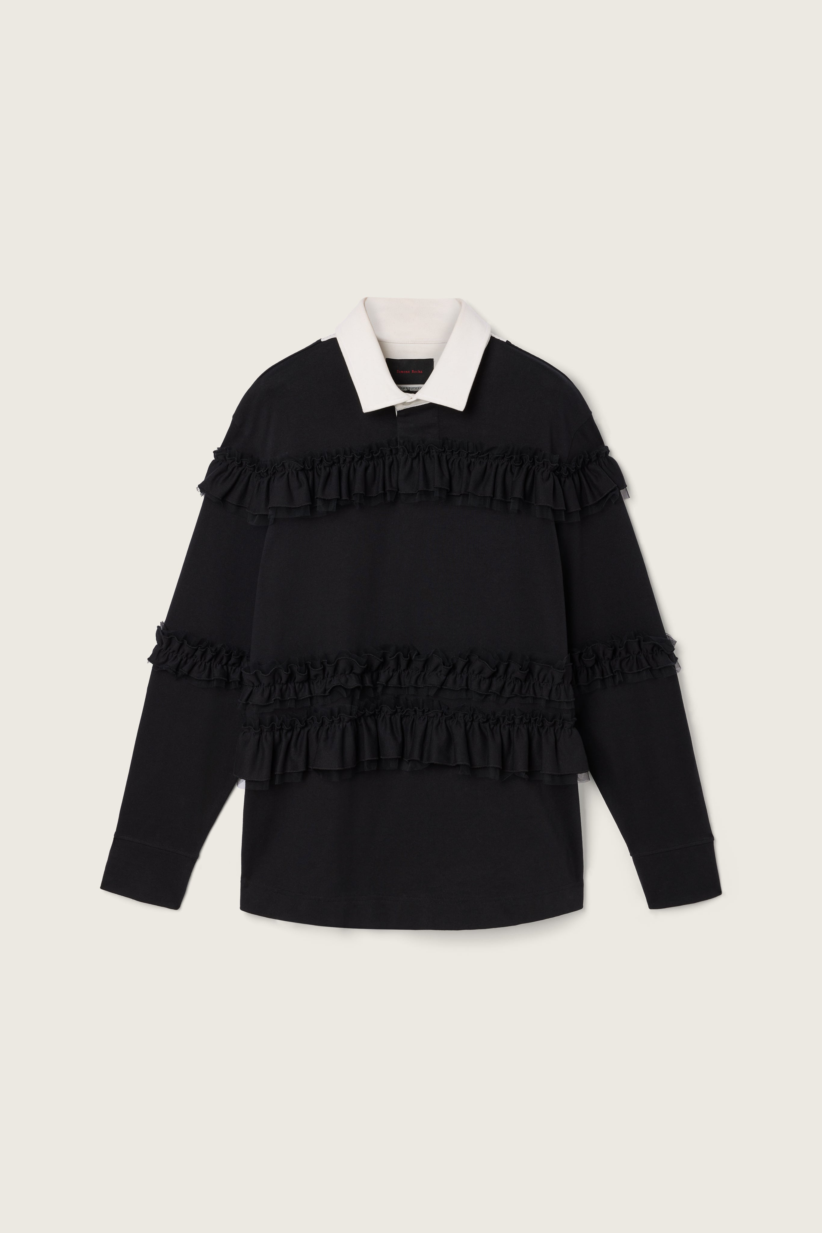 A modern spin on a classic rugby-style shirt, it features ruffles throughout making it distinctive to Simone Rocha. The model is wearing this style with the Wide Leg Multi Belt Loop Trousers. Product Details Cotton structured jersey rugby shirt - Tonal ruffle detail throughout - Contrasting collar - Oversized fit Composition: Self: 100% Cotton Self 2: 100% Cotton Self 3: 100% Nylon SKU: 5360 1282 BLACK Size & Fit Model is wearing size Small.