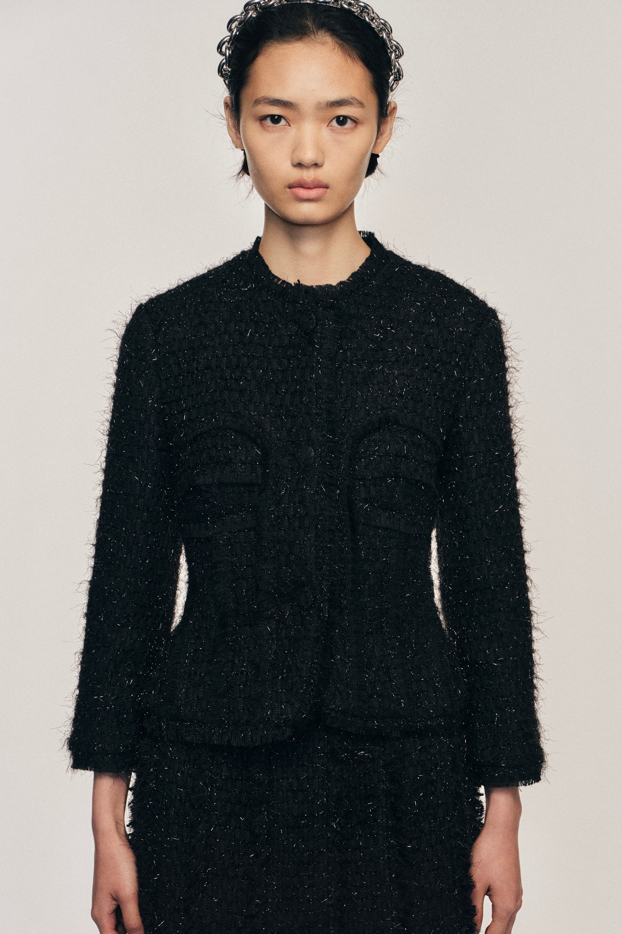 A tinsel tweed jacket with a patchwork bust detail for a fitted silhouette. The hem appears frayed for a more deconstructed appearance. The model is wearing this style with the Multi Slit Fray Skirt. Product Details Tweed jacket Composition: 32% Recycled Cotton 25% Wool 20% Polyester 8% Nylon 6% Recycled Polyester 6% Cotton 2% Other Fibres Trim: 100% Cotton Lining: 100% Viscose SKU: 6138 1262 BLACK Size & Fit Model is wearing size 6.