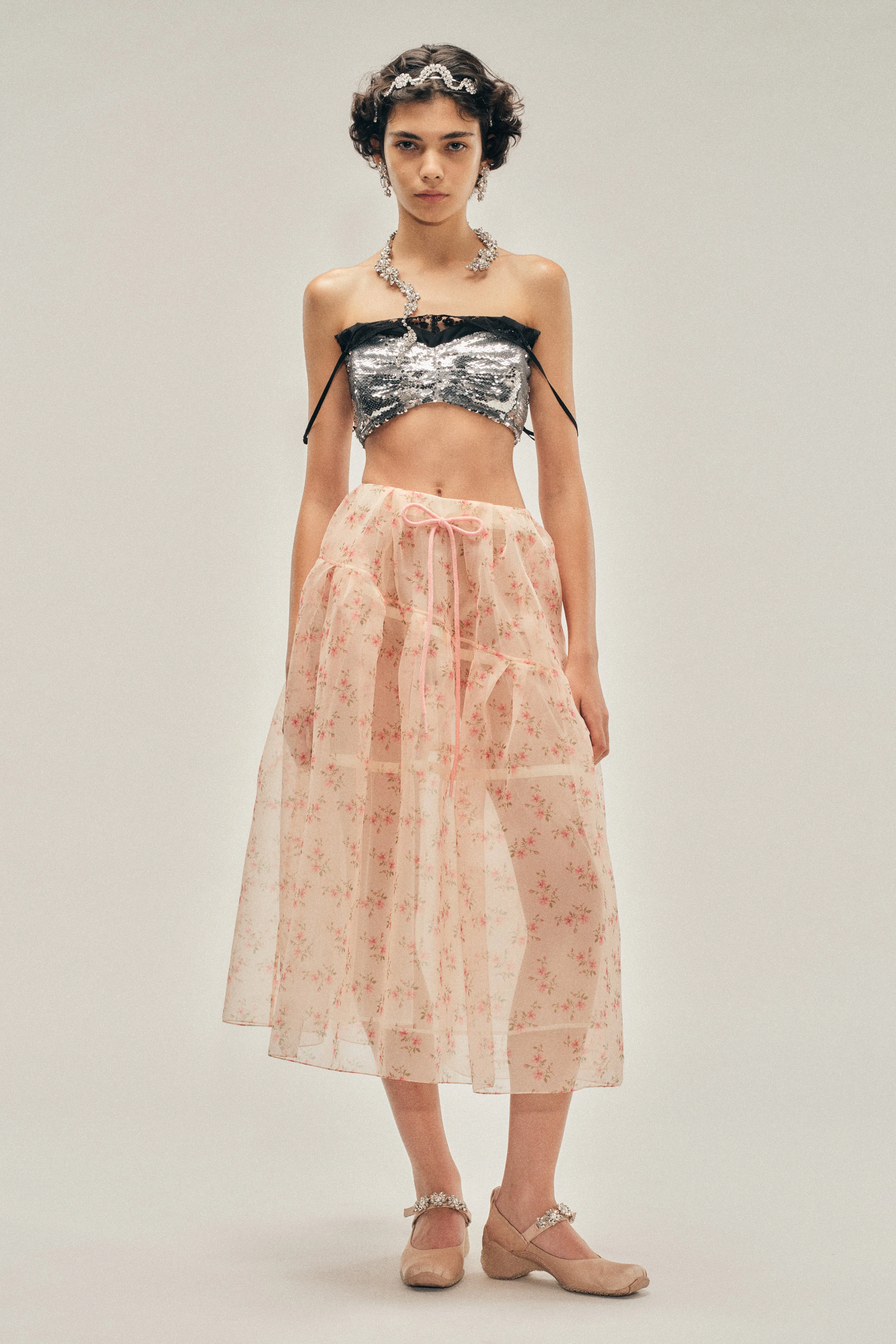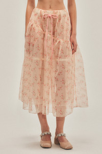 A flouncy skirt in floral embroidered organza with tulle underlayer for volume. Boning hoops sculpt the full silhouette, while side seam pockets and a fuzzy chenille bow add finishing touches. Product Details Organza skirt - From Look 1 on the runway - Seasonal chenille bow detail - Pockets at side seam - Zip closure Composition: SELF1: 100%PL SELF2: 100%PA RIBBON: 100%CO TRIM: 100%PES SKU: 3179E 1297 NUDE FLORAL/PINK