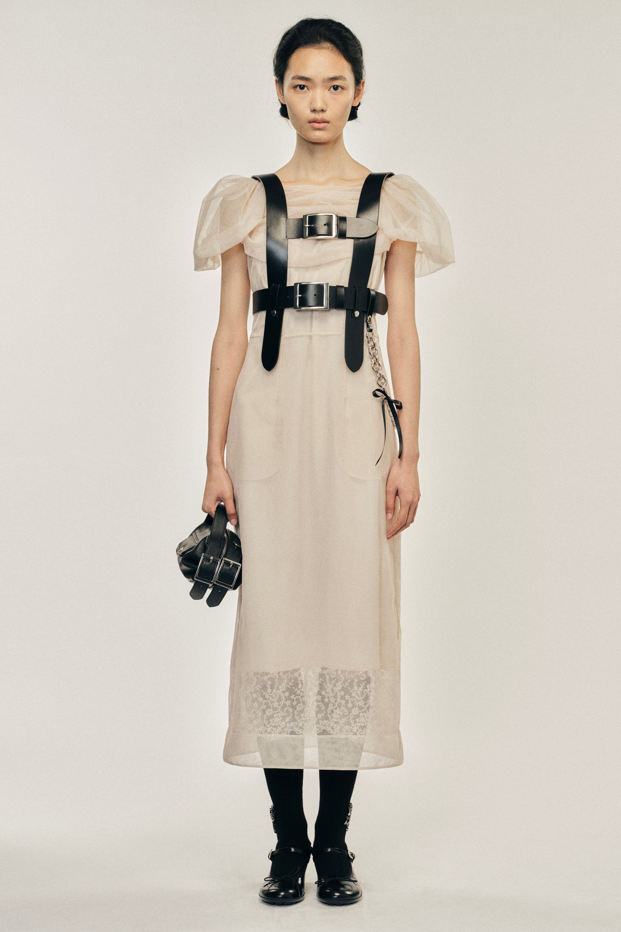 This sheer nude tulle dress has a layered construction where it is gathered at the bust and features a layered puff sleeve. On the runway, it is styled with the Pearl Chain Leather Harness. Product Details Sheer tulle dress - From Look 17 on the runway - Double sleeve detail - Pockets at side - Slim fit Composition: 100% Nylon SKU: 7424 0069 NUDE Size & Fit Model is wearing size 6.