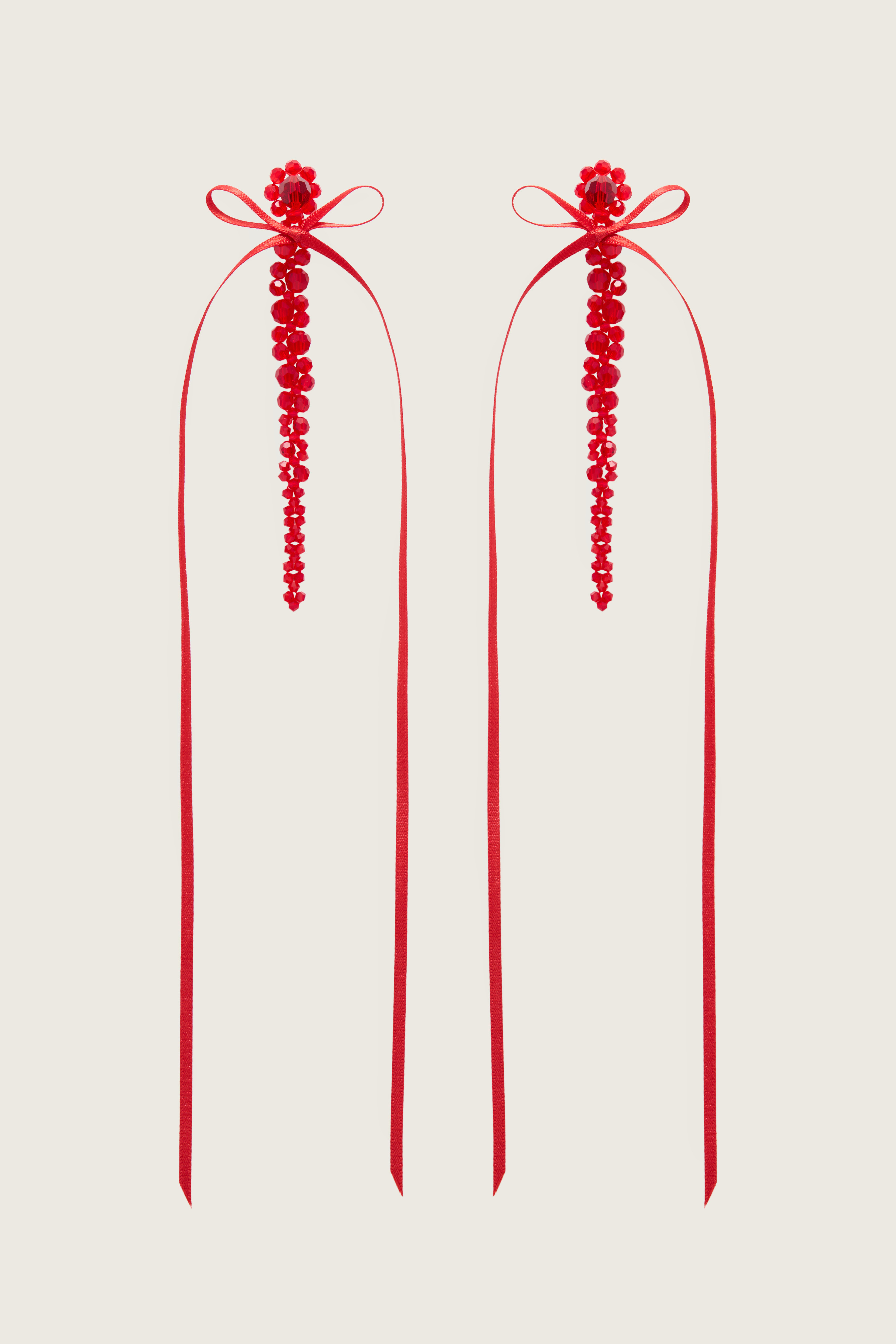 The classic drip earring paired with a slim bow ribbon, the crystals provide a luminous finish, adding a subtle, yet distinctive flair. Product Details Crystal drop earrings - Ribbon bow detail - Beaded daisy at base - Glass crystal beading Composition: 67% Crystal (Glass) Polyester 25% 8% Brass SKU: ERG410S 0903 RED