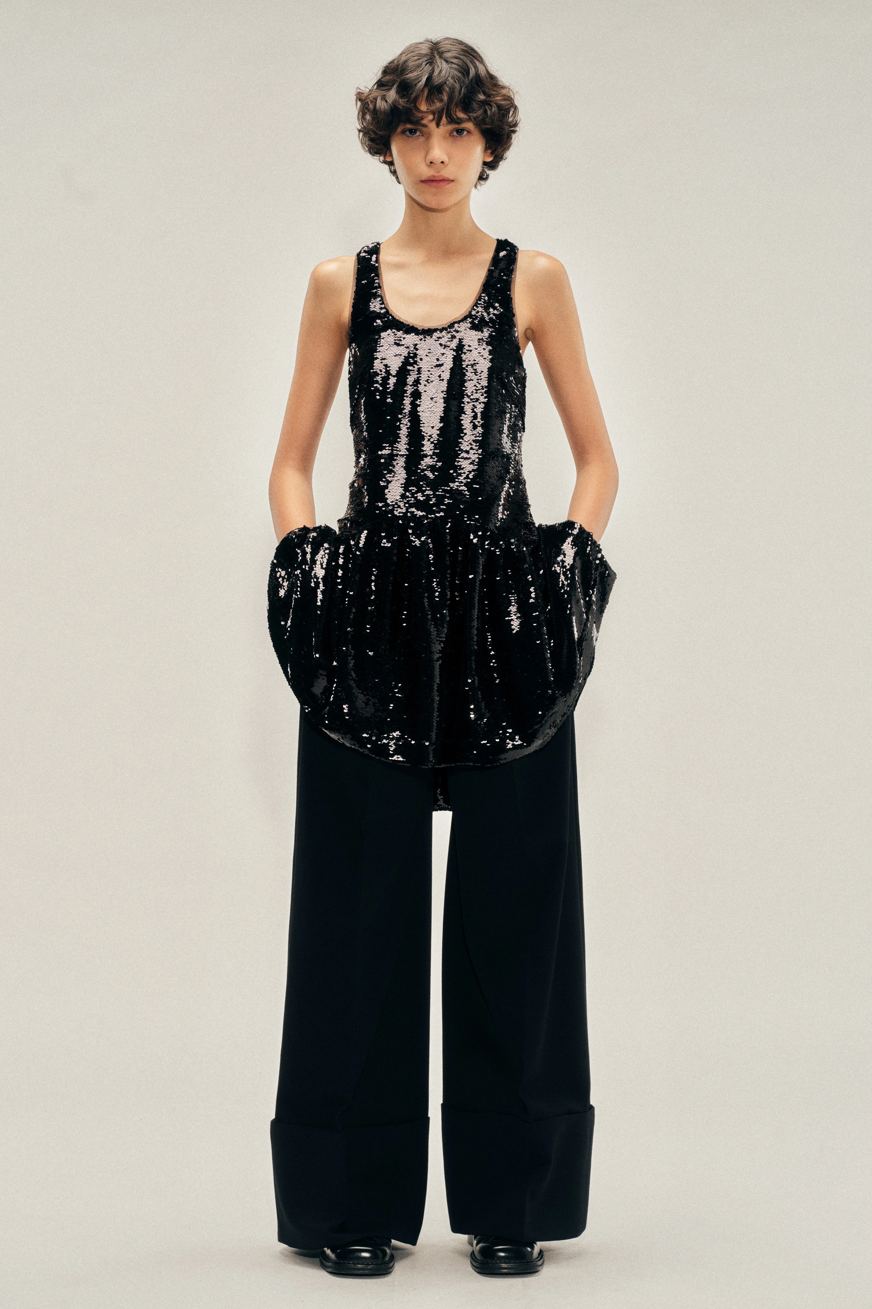 Mini tank dress encrusted in black sequins, featuring a gathered peplum hem at the waist. Rear darts taper the silhouette, capturing the collection's youthful spirit with a sculpted finish. Product Details Sleeveless sequin dress - From Look 46 on the runway - Scoop neckline - Peplum hem detail - Back zip closure Composition: SELF: BASE: 100%PES SEQUINS: 100%PET LINING: 60%AC 40%CU SKU: 7474 1300 BLACK