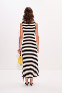 Soft knit midi dress designed with a close, flattering fit through the body. Finished with subtle asymmetrical slits accented by delicate fringe at the slits and armholes for added texture and detail. Color: black/white stripe DETAILS Model: W4656-6079-96470 65% VISCOSE 35% NYLON Imported MACHINE WASH COLD, DO NOT BLEACH, LAY FLAT TO DRY, IRON LOW HEAT SIZING True to size