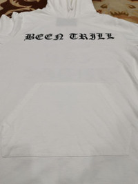 PLEASE READ TERMS & CONDITION BELOW BEFORE BUY BEEN TRILL HOODIE ITEM CONDITION : PRE-OWNED/AUTHENTIC/VINTAGE ============================================= CONDITION : PRE-OWNED WITH A GOOD CONDITON MEASURES ABOUT (APPROXIMATELY) (Size: please refer actual measurement given and compare with your best Fiting clothes) # ARMPIT TO ARMPIT : +- 21 INCHES # LENGTH(BACK COLLAR DOWN) : +- 30 INCHES # COLOUR : WHITE # CONDITION : GOOD (LIMITED ITEM) NOTE : (please see the pictures for details) Ship to worldwide All items will be shipped out within 1-3 days after payment received. Usually, it takes about 18 - 24 business days for delivery for all International order. Sometimes, It may take up to 24 working days. However after 30 days your item still not arrive, please contact us immediately. For Holiday Period (eg: Christmas, Chinese New Year and etc), shipping will take longer time to reach. Please be patient when awaiting shipment. PAYMENT PayPal ONLY ***PLEASE GIVE YOUR CONTACT NUMBER AND EMAIL FOR DELIVERY DETAILS All winning buyers are expected to pay within 3 days VISIT MY STORE FOR MORE ITEMS...THANKS