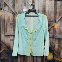💥 Issey Miyake HEART HAAT Pastel Turquoise Light Blouson/ Buttons Up Blouse Top▪️ ⚠️ Read the description carefully before purchase. 🔹DESCRIPTION ▪️Manual Measurement: 🔹Chest : 20 inch 🔹Length : 22 inch ** All measurements are done on a flat surface. ▪️Size on tag: 2 🔹CONDITION: 8.5/10 ▪️Used, in good condition. ▪️NO stains, NO rips and NO holes. ▪️Judge pics for any sign of use. ▪️The colour is slightly different due to lighting. ▪️Refer to pictures for further details. ▪️Shipping Worldwide via: DHL Express/FedEx ▪️All sales are FINAL. ▪️Confirm your size and satisfied the item before purchase. 🚫 NO Return, NO Exchange & NO Refund. 🎌 安心して信頼できる売り手から購入する。 •• Thank you for visiting my store. •• Have a nice day.
