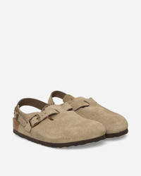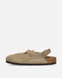Birkenstock Tokio Suede Sandals Taupe The Birkenstock Tokio is a variation on the classic Boston. The model has a heel strap and can be worn all year round. The upper is made of extra soft suede that fits like a second skin. - Suede Upper - Suede Lining - Narrow FIt - Adjustable Straps - Contoured Cork-Latex Footbed - EVA Sole Unit - Made in Germany - Style Code: 1028323