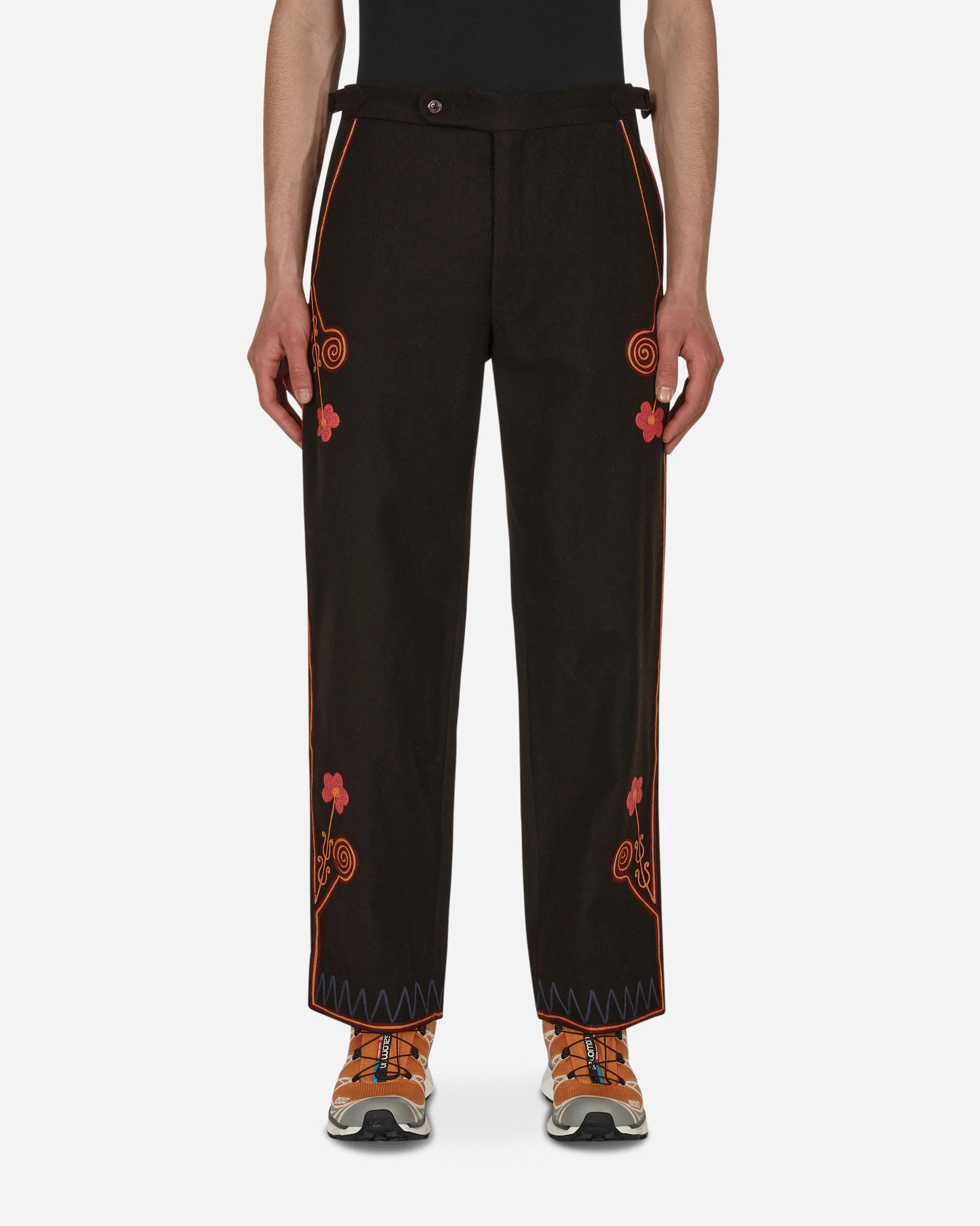 Bode Rancher Embroidered Trousers Brown Multi - 100% Merino Wool - Lining: 100% Cotton - Hook and Loop Closure - Zip-Fly - Chainstitch Floral Embroidery - Two Side Pockets - Two Back Pockets - Style Code: MR24PA03W002 111 SIZE & FIT Model is 6ft 1in/1.86m with a 28"/72cm waist and wears size 32. Measures (Size 32): 40cm Waist, 28cm Rise, 103cm Outseam, 75cm Inseam, 21cm Ankle.