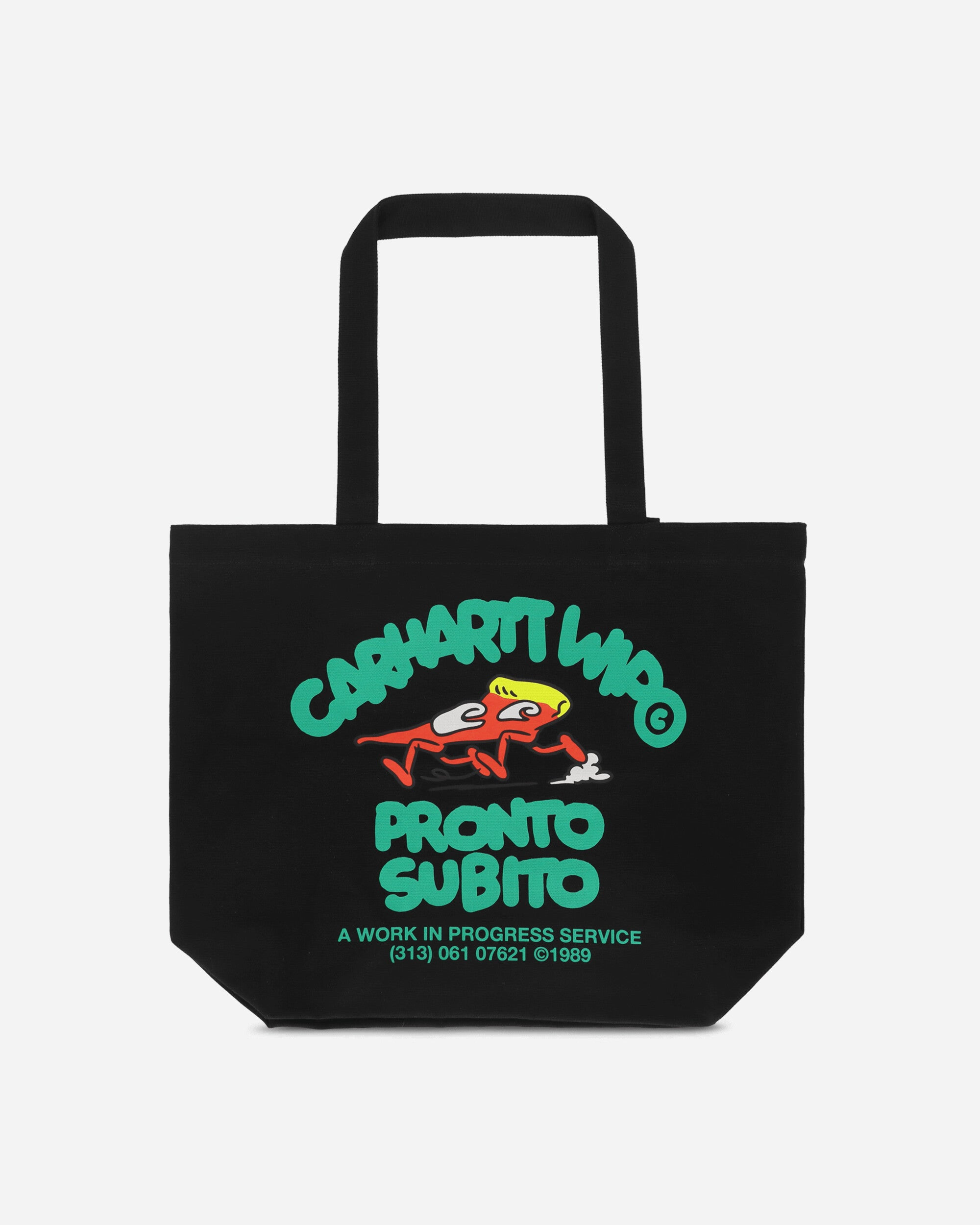 Carhartt WIP Canvas Graphic Tote Pronto Print / Black The Canvas Graphic Tote is made from robust Dearborn Canvas and features a graphic print on the front. It is an unlined style with interior binding on the seams for additional protection. The bag is complete with a swinging inner pocket. - 100% Cotton - Dearborn Canvas - Double Carry Handle - Swinging Pocket at Inside Back - Volume: 15 liters - Graphic Print at Front - Style Code: I033975 34IXX SIZE & FIT 37cm Height, 46cm Width, 14cm Depth.