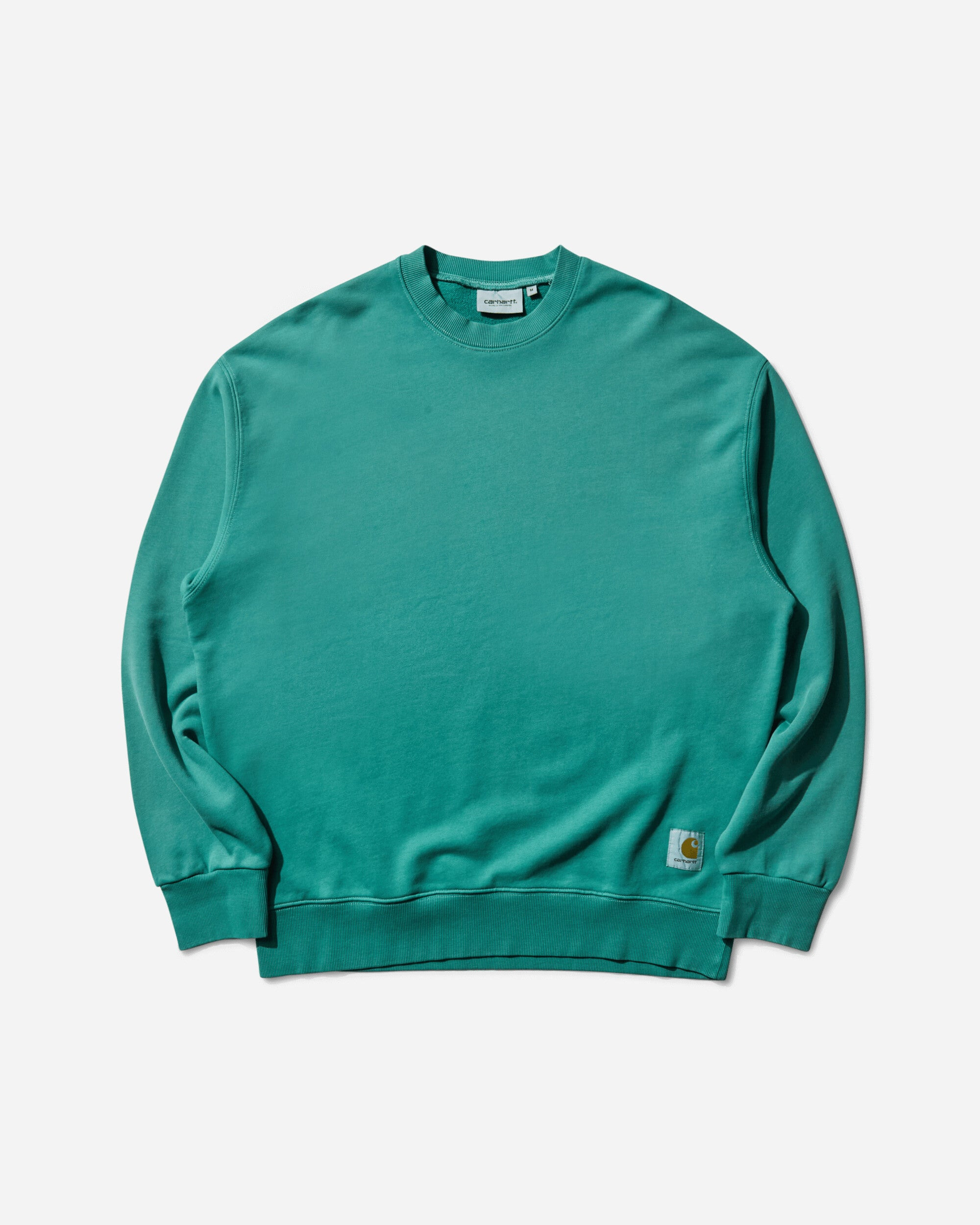 Carhartt WIP Hudson Crewneck Sweatshirt Saguaro The Hudson Sweatshirt is made in a loose fit from heavyweight, unbrushed cotton jersey with a tactile loopback construction. The item has undergone a 'chalk wash', offering a sun-faded effect with a strong variation in color on details. A woven Square Label completes the design. - 100% Cotton - Loose Fit - RIbbed Collar, Cuffs and Hem - Woven Square Label - Style Code: I035186 2ZU5F