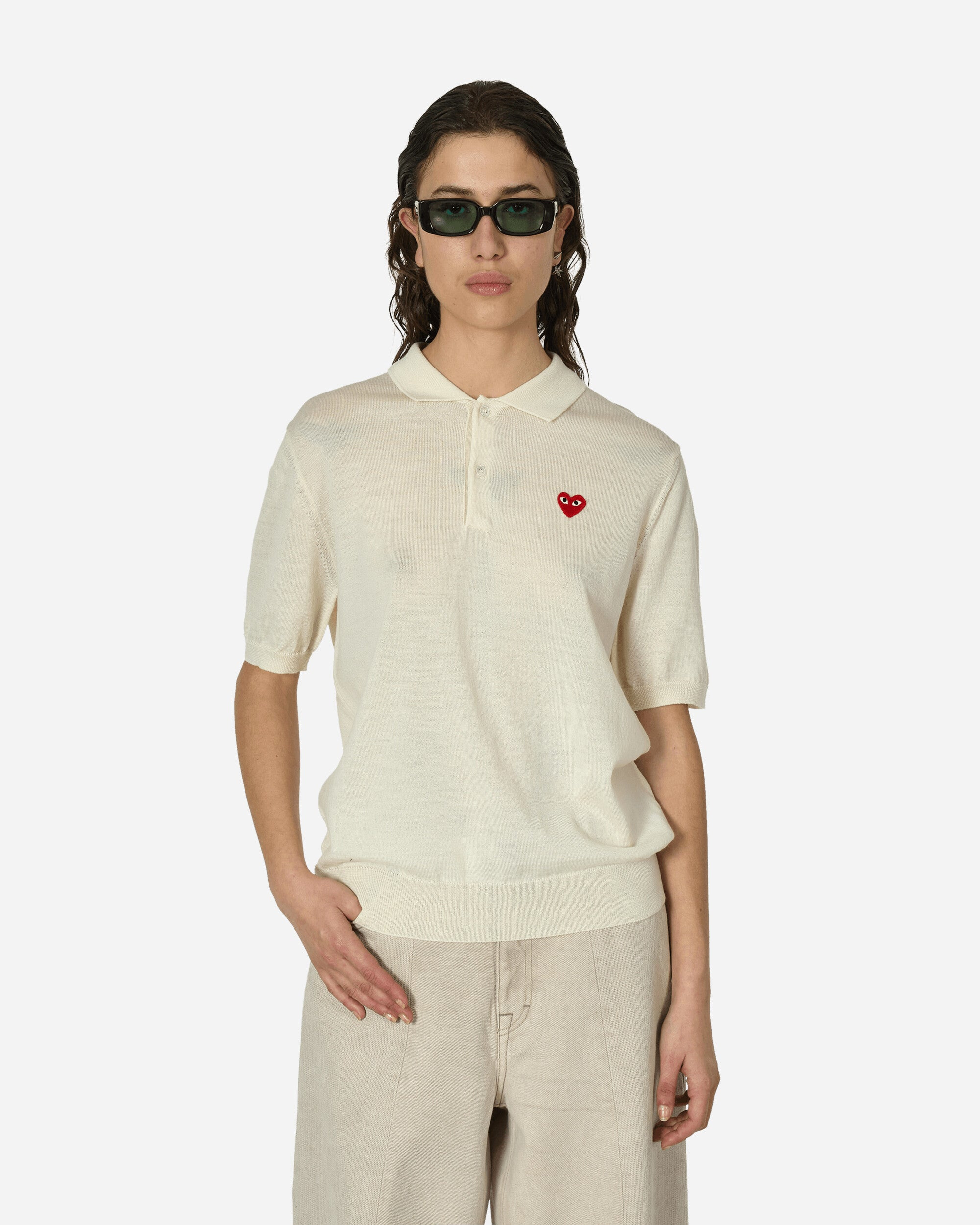 Comme des Garçons PLAY Red Heart Polo Sweater Off White The iconic Comme des Garçons PLAY Heart was created to be an evergreen staple for every season and every occasion. This timeless polo shirt is not to be missed. - 100% Wool - Regular Fit - Ribbed Collar - Two-Button Placket - Embroidered Heart at Chest - Made in Japan - Style Code: P1N094 6 SIZE & FIT Model is 5ft 8in/1.76m with 30"/78cm chest and wears size S.