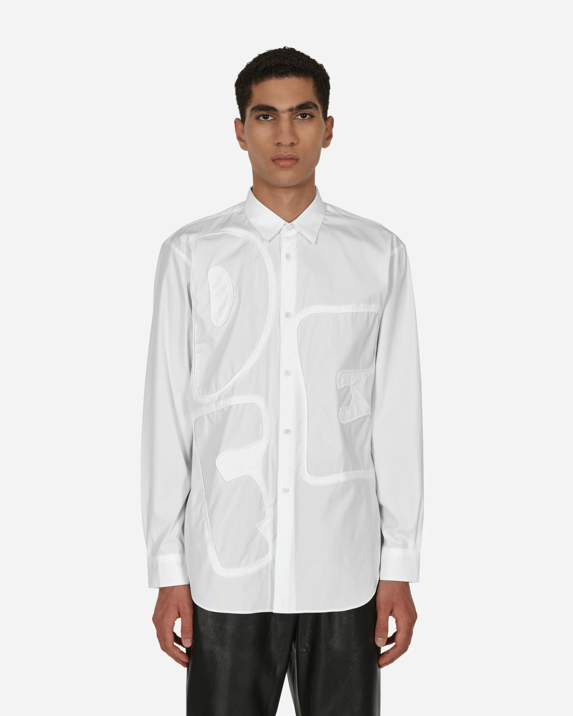 Comme Des Garçons Shirt Alphabet Shirt White - 100% Cotton - Classic Collar - Button Closure - Self Colour Alphabet Cut Outs - Single-Button Cuffs - Curved Hem - Made in France - Style Code: FJ-B008-W22 2 SIZE & FIT Model is 6ft 1in/1.86m with 35"/90cm chest and wears size M. Measures (Size M): 50cm Shoulders, 54cm Chest, 63cm Sleeve, 80cm Length, 56cm Hem.