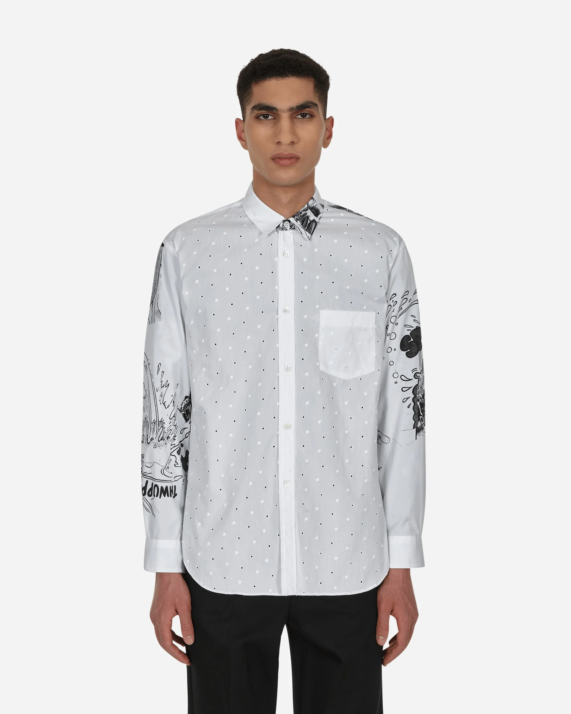Comme Des Garçons Shirt x Christian Marclay Printed Shirt White Print - 100% Cotton - All-Over Dot Pattern - Christian Marclay Print - Button Closure - Chest Pocket - Single-Button Cuffs - Curved Hem - Made in France - Style Code: FI-B053 1 SIZE & FIT Model is 6ft 1in/1.86m with 35"/90cm chest and wears size M. Measures (Size M): 50cm Shoulders, 55cm Chest, 60cm Sleeve, 78cm Length, 55cm Hem.