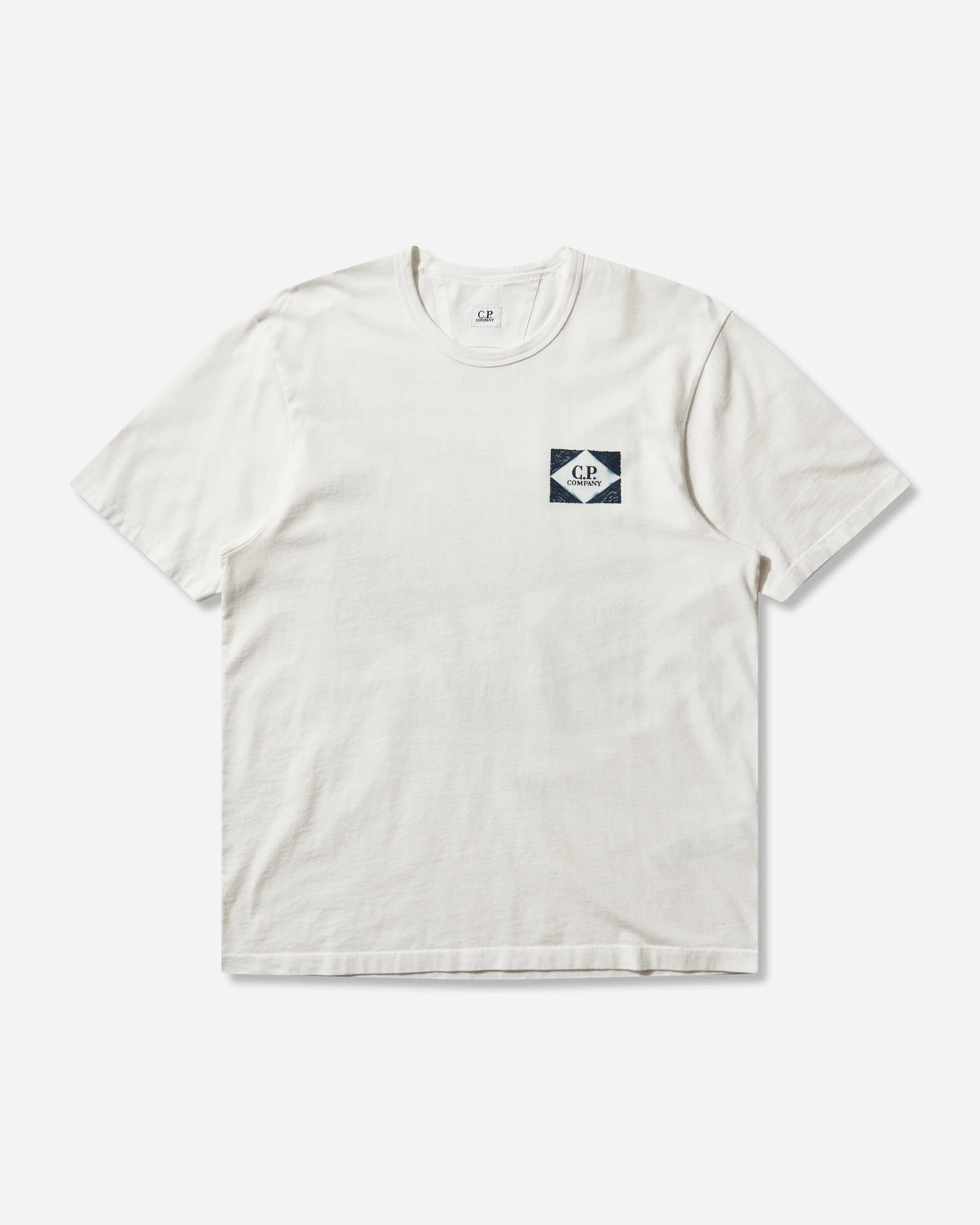 C.P. Company Jersey T-Shirt Gauze White This short-sleeved T-shirt made of 100% cotton features a Graphic printed at front and back. - 100% Cotton - Regular Fit - Ribbed Collar - Printed Graphic at Front and Back - Style Code: 20CMTS267A-110656W 103