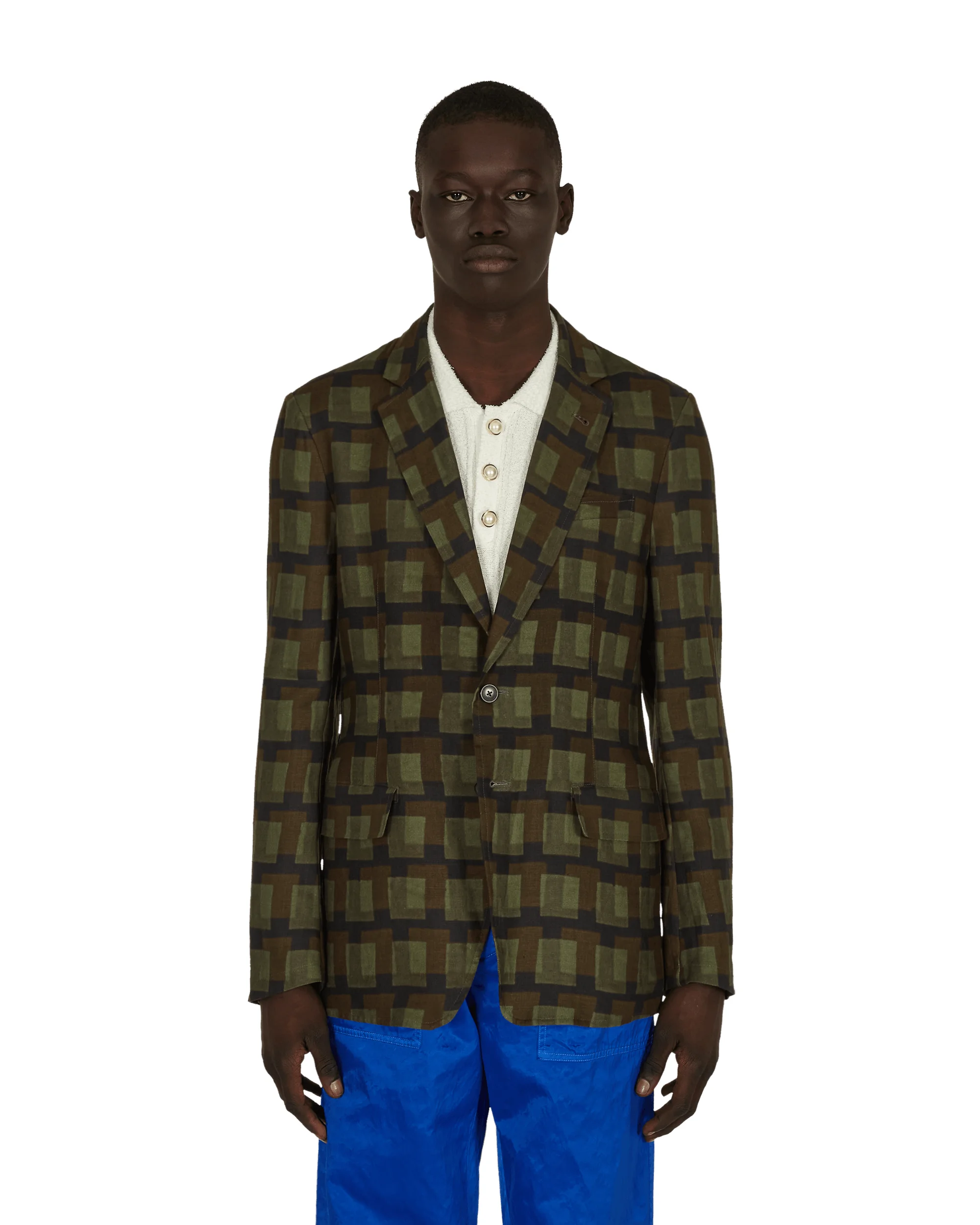 Dries Van Noten Len Lye Boxing Blazer Khaki Dries Van Noten pays homage to Len Lye. A key figure in the post-war New York avant-garde art scene and a pioneer in experimental film and kinetic sculpture, - 100% Linen - Lining: 100% Cotton - All-Over Printed Graphic - Notched Lapel Collar - Button Closure - Welt Chest Pocket - Flap Pockets at Waist - Button Cuffs - Style Code: 211-20425-2080 606 SIZE & FIT Model is 6ft 1in/1.85m with 34''/86cm chest and wears size L. Measures (Size L): 46cm Shoulders, 50cm Chest, 67cm Sleeve, 78cm Length, 57cm Hem.