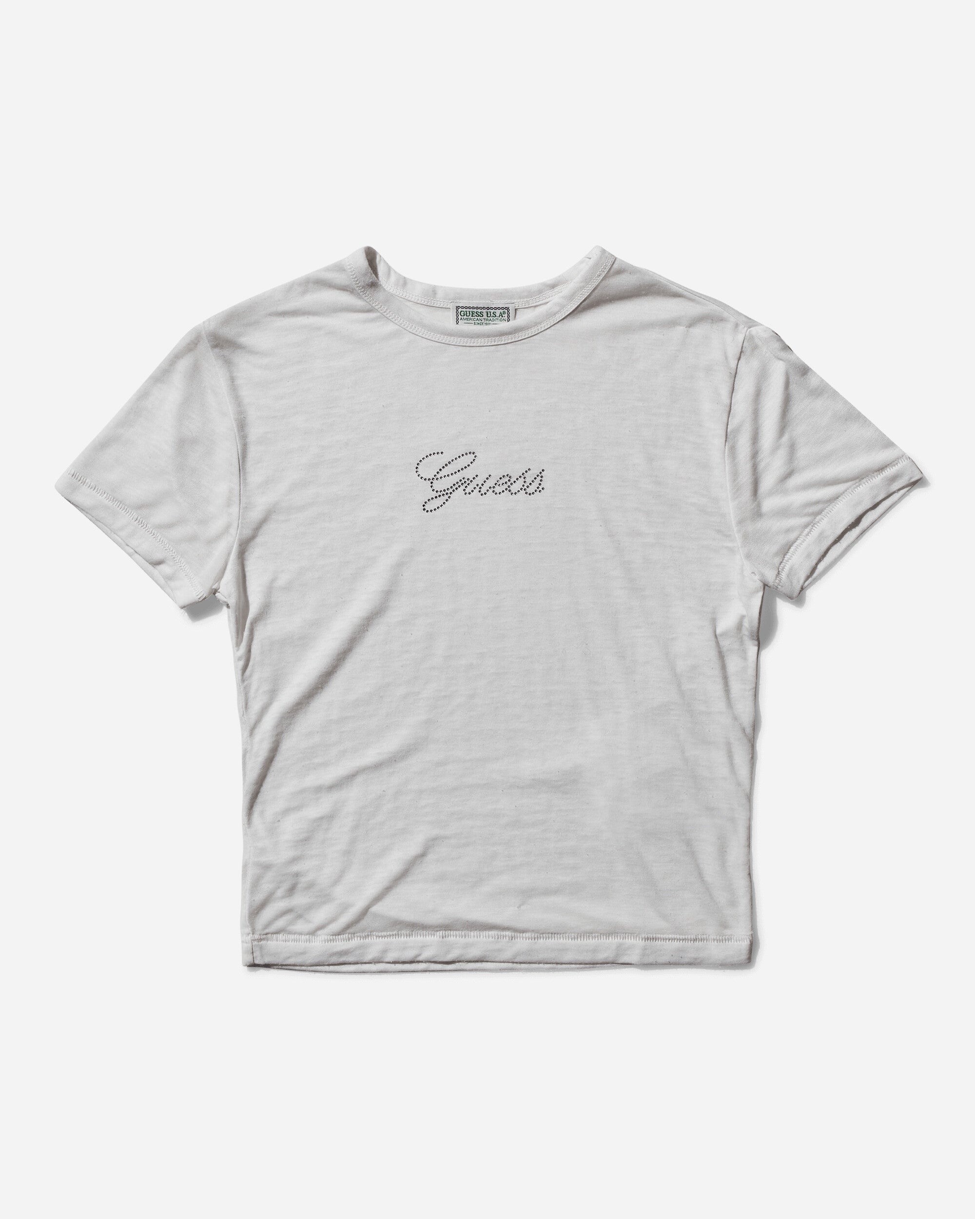 Guess USA Classic Logo Baby Tee Alabaster White Digging into America's Western and rural landscapes of the 80s and 90s, Guess USA aims to date back in and recall The American Way of those years. Guess USA's line differs from classic collections, firstly, for being focused on the American free spirit, cars, motorcycles, leather, the desert, and the idea of the Wild West. - 50% Cotton, 50% Polyester - Cropped Fit - Ribbed Crewneck - Rhinestones Logo at Front - Style Code: W4GP72KCID0 F0I6