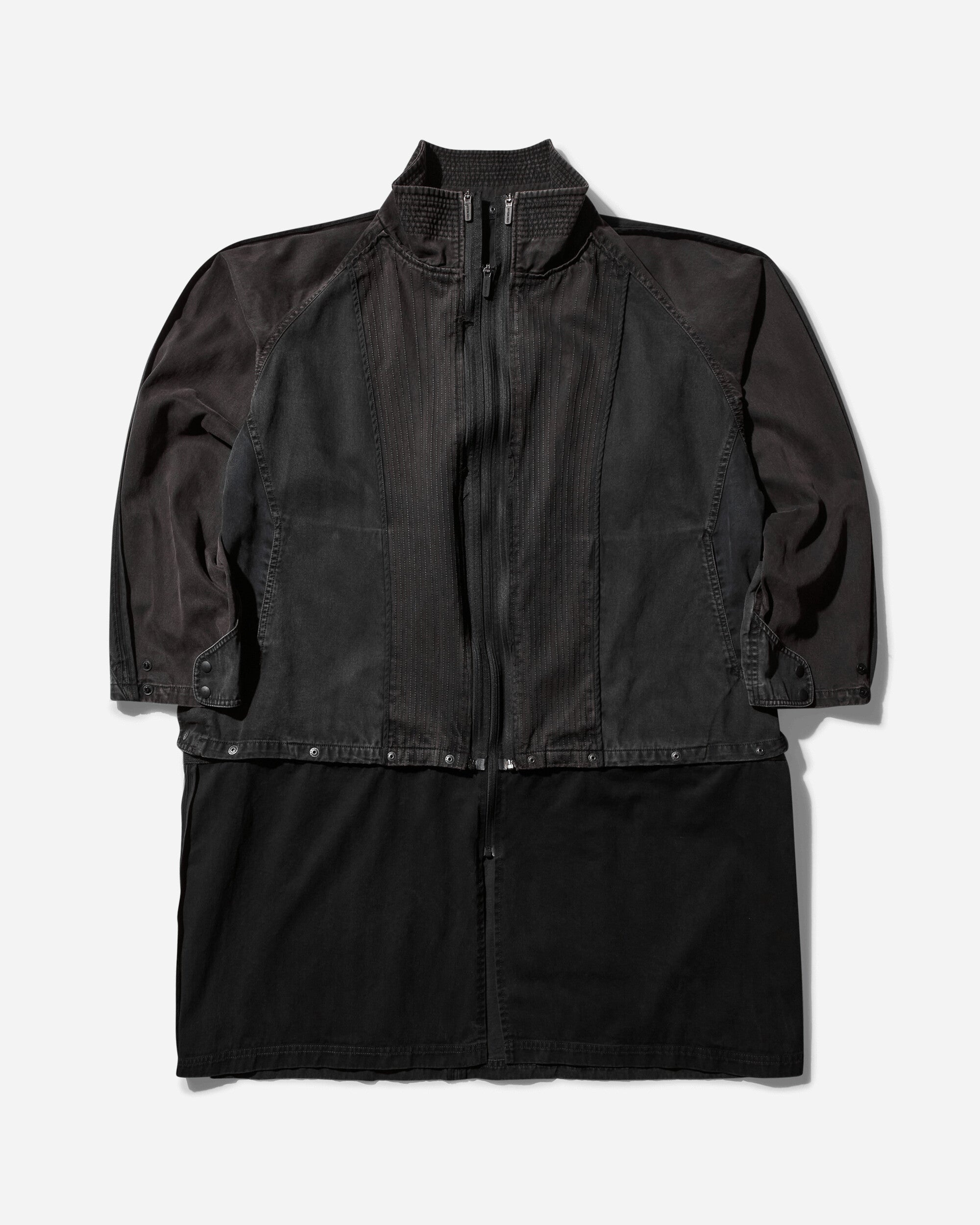 HYEIN SEO Convertible Patchwork Coat Stone HYEIN SEO blends dystopian elements with rebellious charm and a touch of wit. Using technical and dramatic silhouettes, bold cut-outs and intricate designs, HYEIN SEO showcases experimental roots with a playful edge. Convertible-length adjustable with snaps at hem, raw edges and contrast stitch detail throughout, patchwork color blocking. - 100% Cotton - Loose Fit - Patchwork Design - Stand-Up Collar - Zip Closure - Two Side Pockets - Adjustable Length - Made in South Korea - Style Code: FW24-CT1ST 001