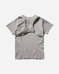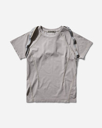 HYEIN SEO Dyed T-Shirt with Backstrap Sand Grey Pigment dyed fitted t-shirt with silicon-printed graphic detail throughout, backstrap features adjustable strap and mini zip pocket. - 91% Cotton, 9% Polyurethane - Garment Dyed - Fitted - Raglan Sleeves - Ribbed Collar - Detachable Backstrap - Zip Closure - Made in South Korea - Style Code: PS25-TS7SG SANDGREY