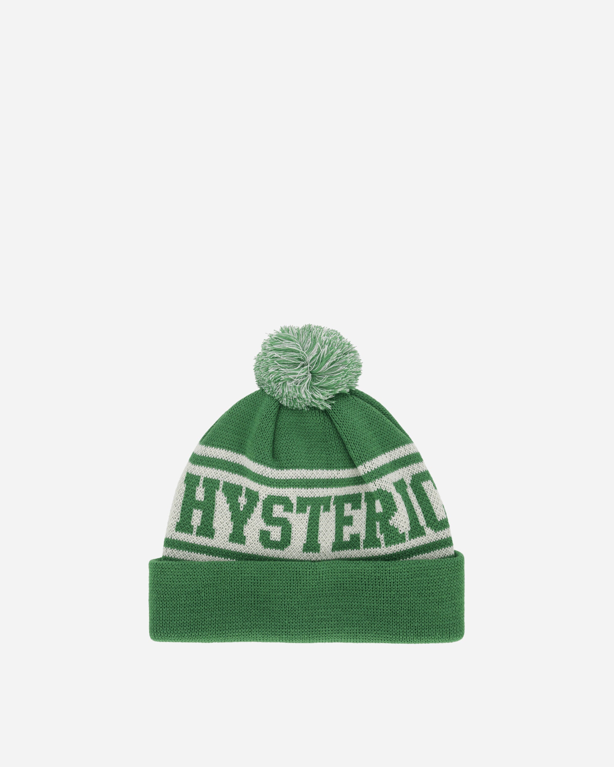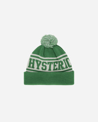 Hysteric Glamour Hysteric Logo Beanie Green This monochrome beanie features a bold jacquard "HYSTERIC" logo and a contrasting pom-pom accent. Designed for style and warmth, it’s crafted from soft, durable knit fabric, making it a versatile addition to your winter wardrobe. - 100% Acrylic - Jacquard Logo - Pom-Pom on Top - Turn-Up Brim - Made in Japan - Style Code: QH089 A