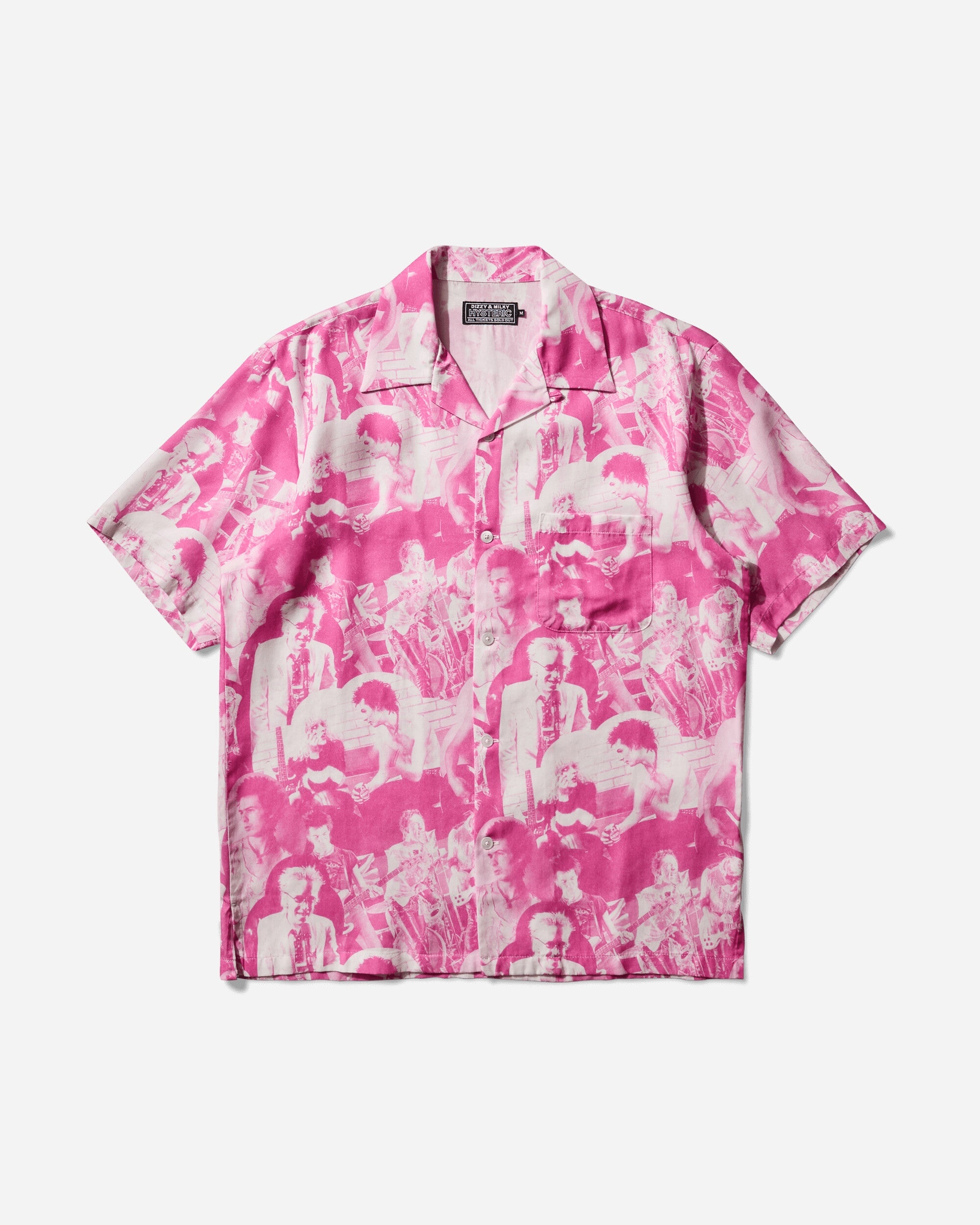 Hysteric Glamour Dennis Morris / Bollocks Anarchy Open Collar Shirt Pink Hysteric Glamour is a Japanese brand known for its bold and provocative aesthetic, that combines elements of rock 'n' roll, pop culture, and contemporary art. The collections frequently feature vibrant prints, extravagant graphics, and unique details. The brand has gained significant popularity in the Japanese fashion scene and has also garnered an international following. - 100% Rayon - Relaxed Fit - Dennis Morris / Bollocks Anarchy Mix Pattern - Open Collar - Button Closure - Chest Pocket - Made in Japan - Style Code: 02251AH16 39
