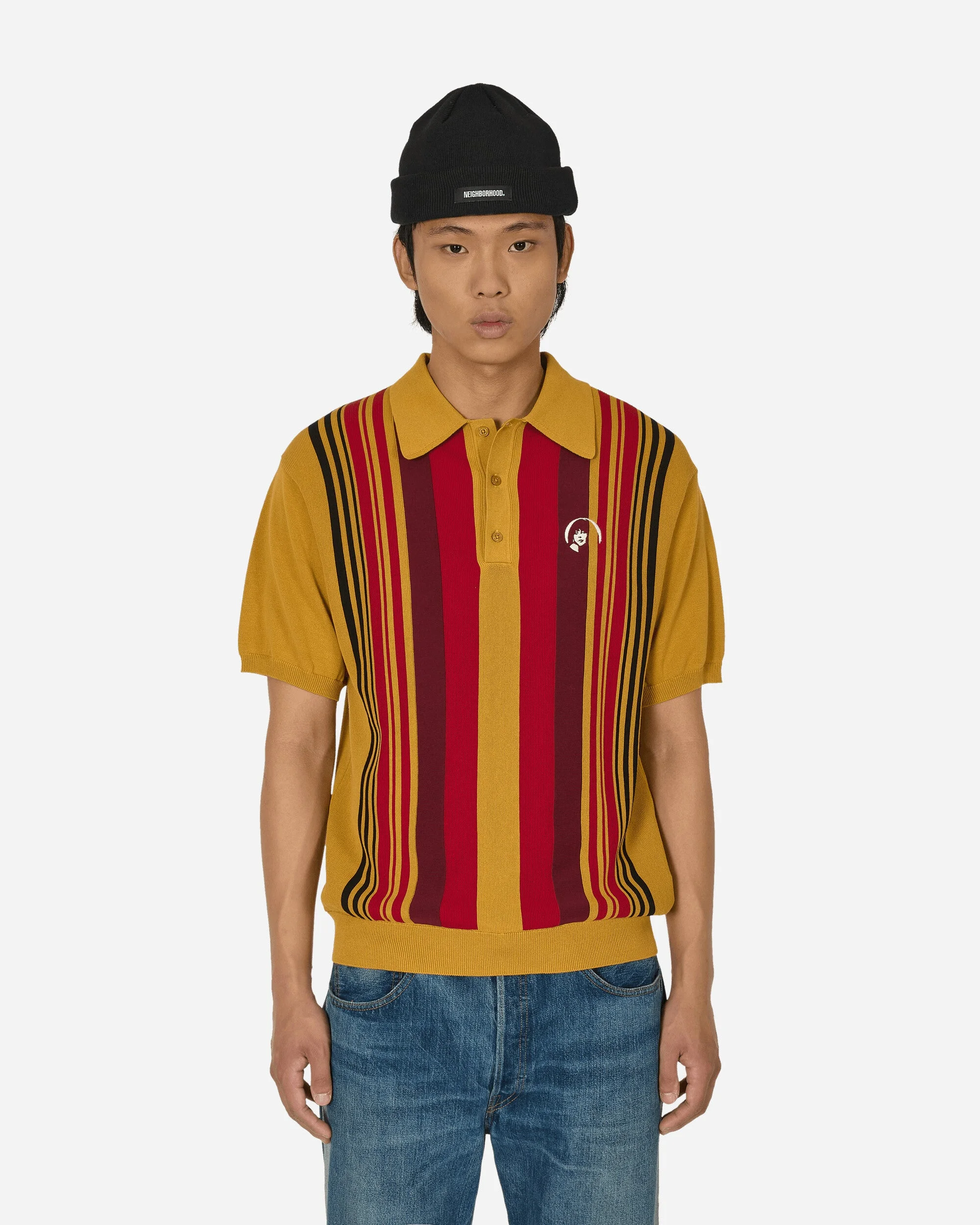 Hysteric Glamour Stay Sick Polo Sweater Yellow This knit polo with distinctive stripes on the front using garter stitch and bag stitch. - 100% Cotton - Regular Fit - Striped Pattern - Ribbed Collar, Cuffs and HeM - Three-Button Placket - Embroidered Graphic at Chest - Embroidered Text at Back - Style Code: 02241NH01 A SIZE & FIT Model is 6ft 2in/1.88m with 35"/89cm chest and wears size L.