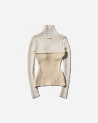 Jean Paul Gaultier Corset Turtleneck Sweater White / Ecru Designed by the Jean Paul Gaultier studio, the Pre-Collection Fall 2025 built around the four elements - water, fire, earth, and air - each evoked through materiality, movement, and mood. This elemental force is channeled through Gaultier’s signature language: sculptural corsetry, precise tailoring, and optical trompe-l’œil illusions that blur the line between garment and fantasy. Stretch merino wool ribbed high neck sweater with corset yoke. - 100% Merino Wool - Tight Fit - Turtleneck - Corset Yoke - Made in Italy - Style Code: 2503WPO005K001 0103