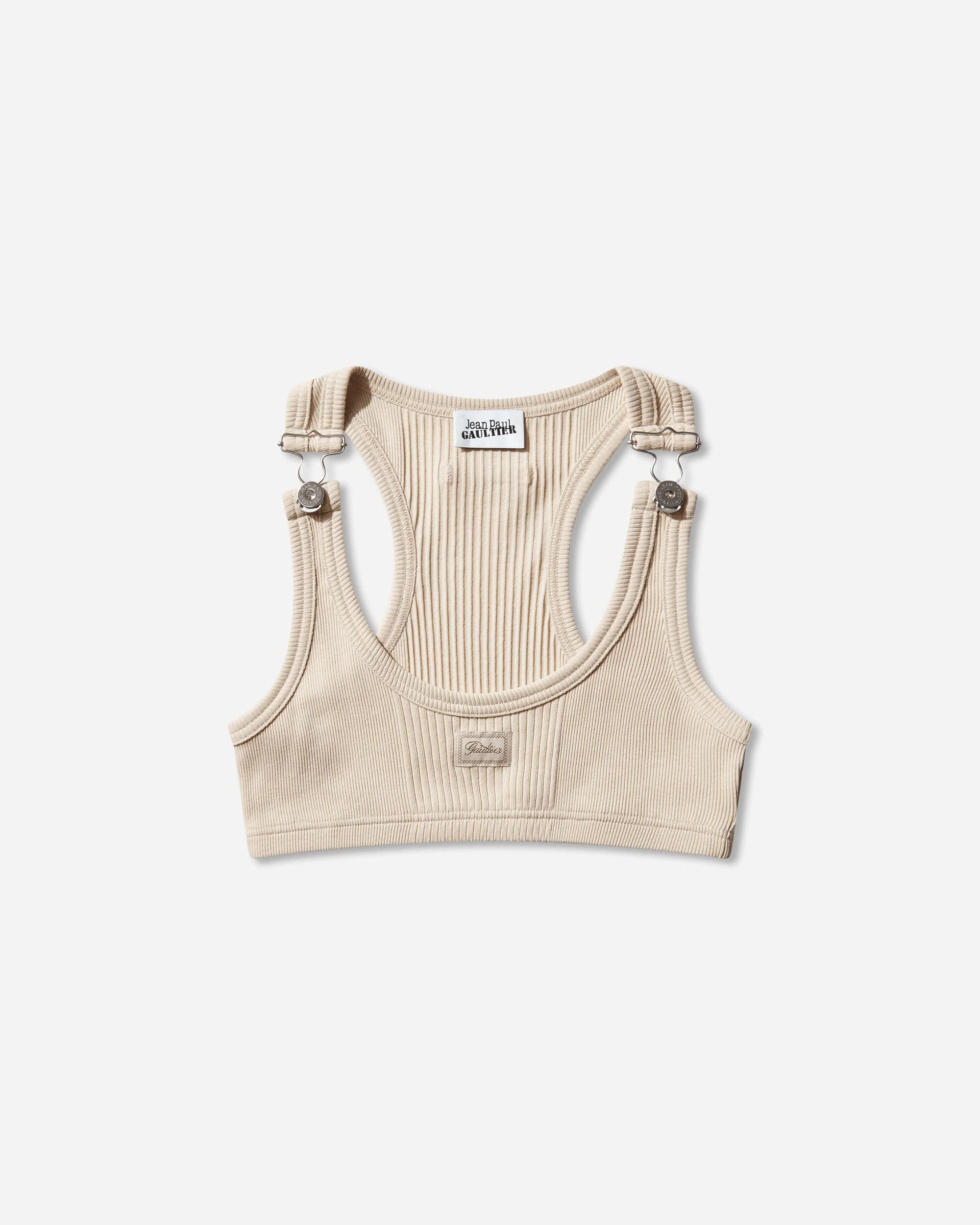 Jean Paul Gaultier Logo Patch Bra Top Beige Inspired by the equestrian world, the Spring 2026 Pre-Collection balances polish with provocation. Structured silhouettes, tailored precision, and refined materials meet the free-spirited absurdity at the heart of Gaultier. It’s sophistication with a wink, elevated, bossy, and unapologetically playful. The collection celebrates control and freedom in equal measure: power dressing with attitude, elegance with edge. Beige ribbed cotton bra with overalls-inspired buckles with Jean Paul Gaultier engraving, and Gaultier patch in front. - 100% Cotton - Tight Fit - Overalls-Inspired Metal Buckles - Buttons with Jean Paul Gaultier Engraving - “Gaultier” Signature Patch at Front - Style Code: 26-01-W-TO430-J014 63