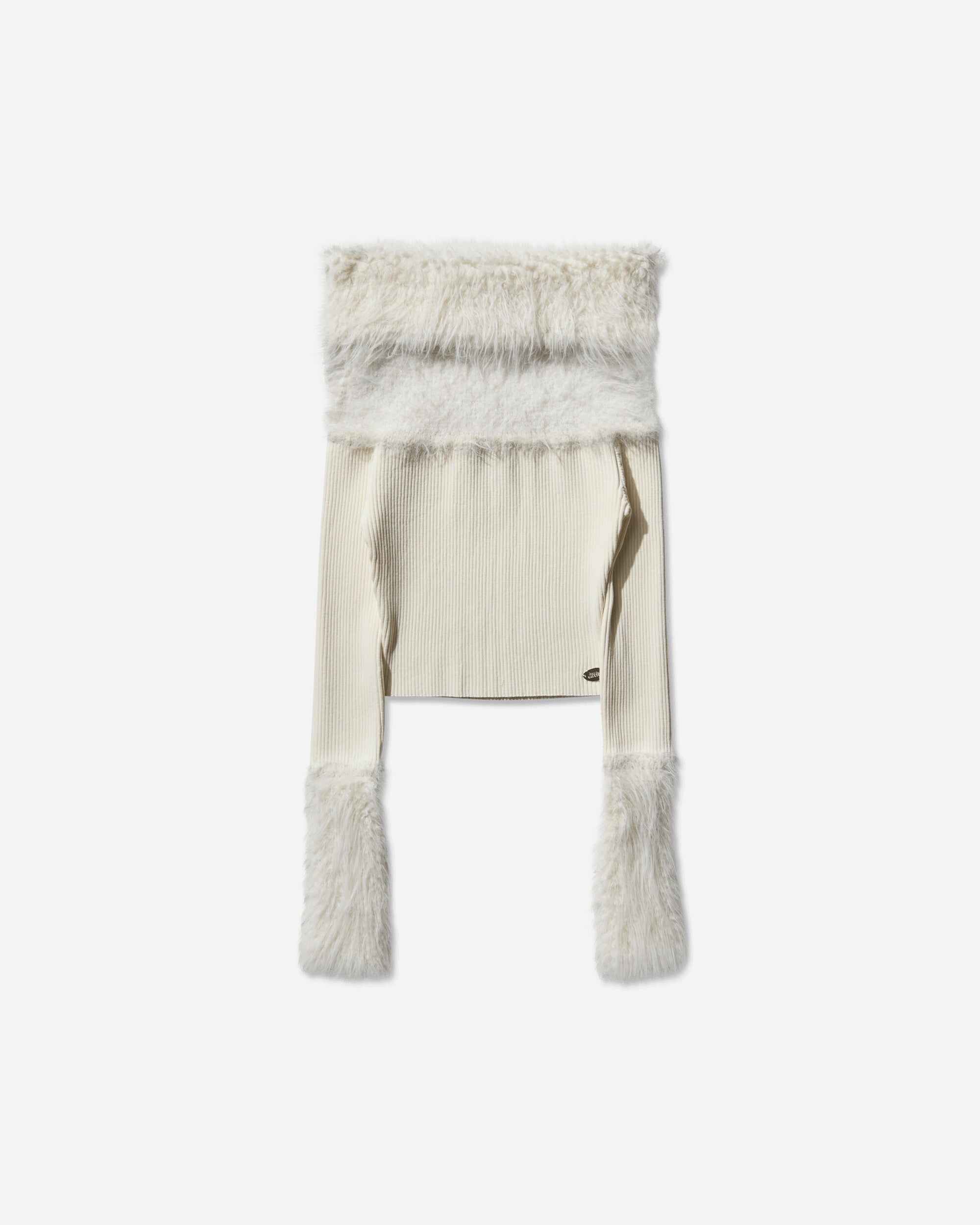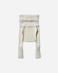 Jean Paul Gaultier Off-Shoulder Hairy Sweater Ecru Designed by the Jean Paul Gaultier studio, the Pre-Collection Fall 2025 built around the four elements - water, fire, earth, and air - each evoked through materiality, movement, and mood. This elemental force is channeled through Gaultier’s signature language: sculptural corsetry, precise tailoring, and optical trompe-l’œil illusions that blur the line between garment and fantasy. Viscose-blend ribbed off-shoulder cropped sweater with hairy details. - 70% Viscose, 30% Polyester - Cropped Fit - Off-Shoulder - Made in Italy - Style Code: 2503WPO018K005 03