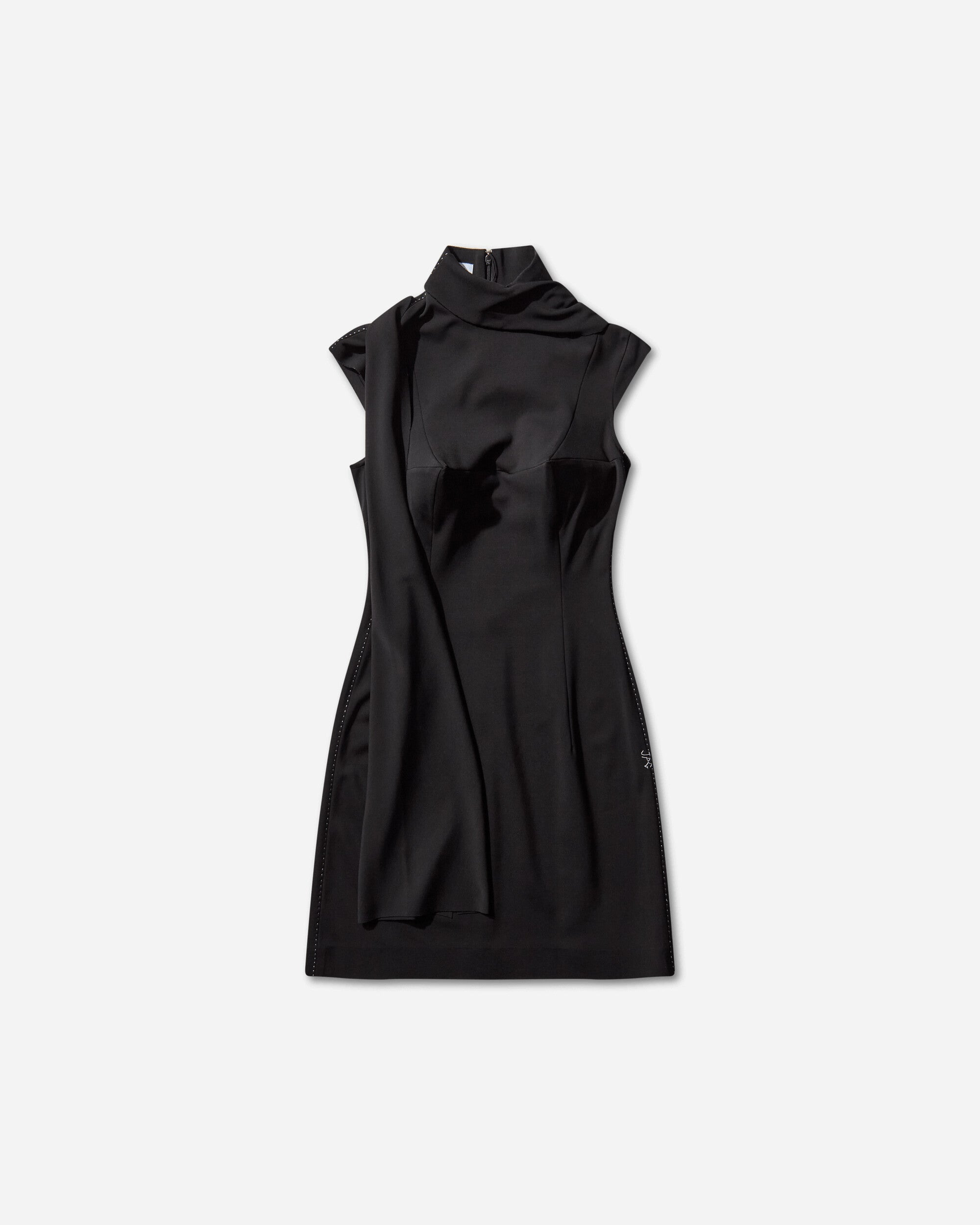 Jean Paul Gaultier Short Conical Dress Black The Winter 2025 ready-to-wear collection builds on Jean Paul Gaultier’s signature codes with a sharp, wearable attitude. It's a celebration of positive nostalgia — nodding to the brand’s iconic past while keeping it fresh, graphic, and forward-looking. Designed by the Jean Paul Gaultier studio, classic silhouettes are reworked, details are subverted, and everyday staples become bold statements. Short conical black jersey dress with Jean Paul Gaultier embroidered contrasting topstitching details and draping in back. - 98% VIscose, 2% Elastane - Tight Fit - Mock Turtleneck - Cone Details on Chest - Scarf-Style Draping at Back - Invisible Zip Closure - Made in France - Style Code: 2504WDR078W021 00