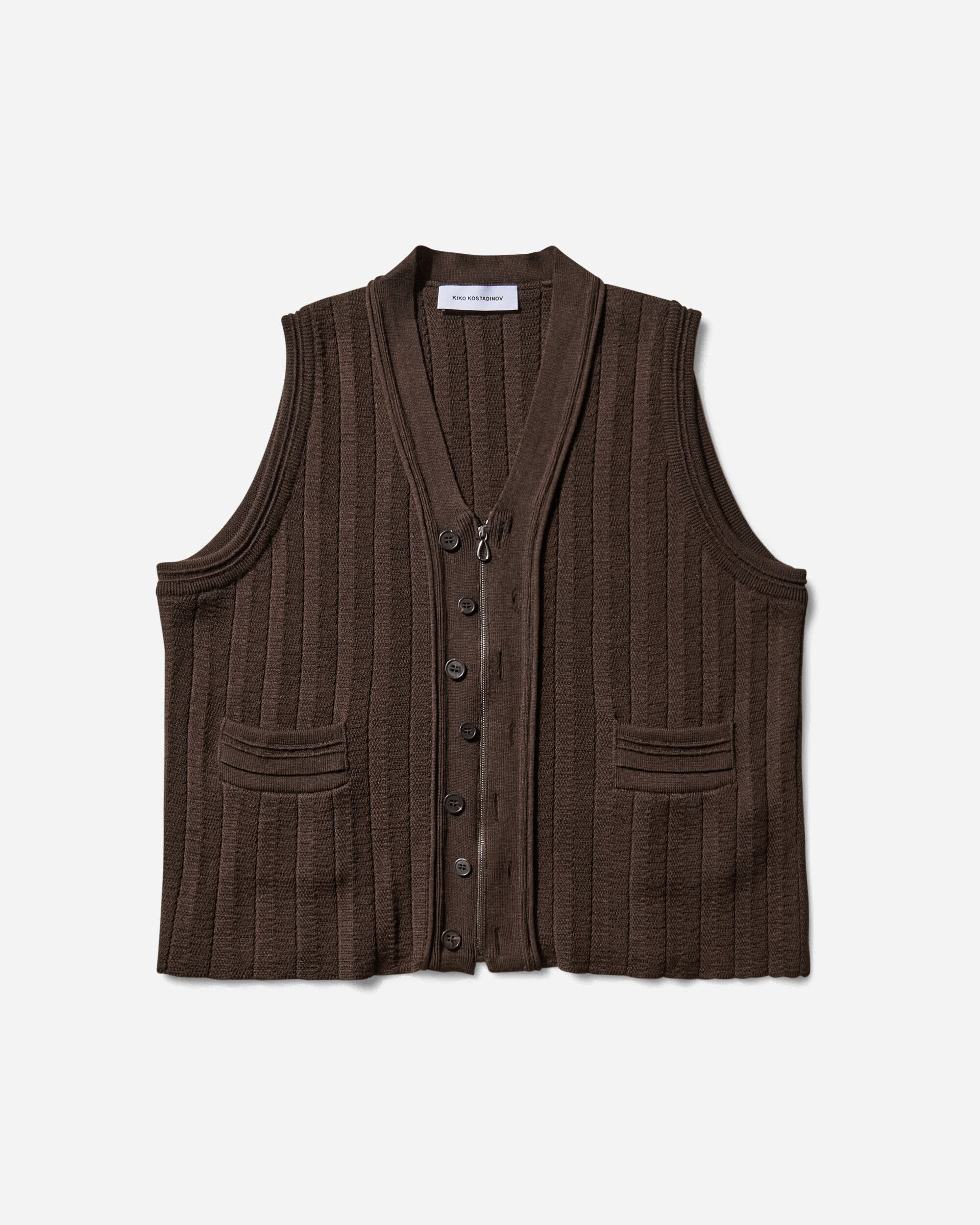Kiko Kostadinov Fitz Knit Vest Maroon The Fitz Vest features cropped fit, button and zip front openings. Two side pockets and it’s crafted from wool silk yarn. - 90% Wool, 10% Silk - Cropped Fit - Button and Zip Closure - Two Side Pockes - Ribbed Trims - Style Code: KKAW25KN02 92