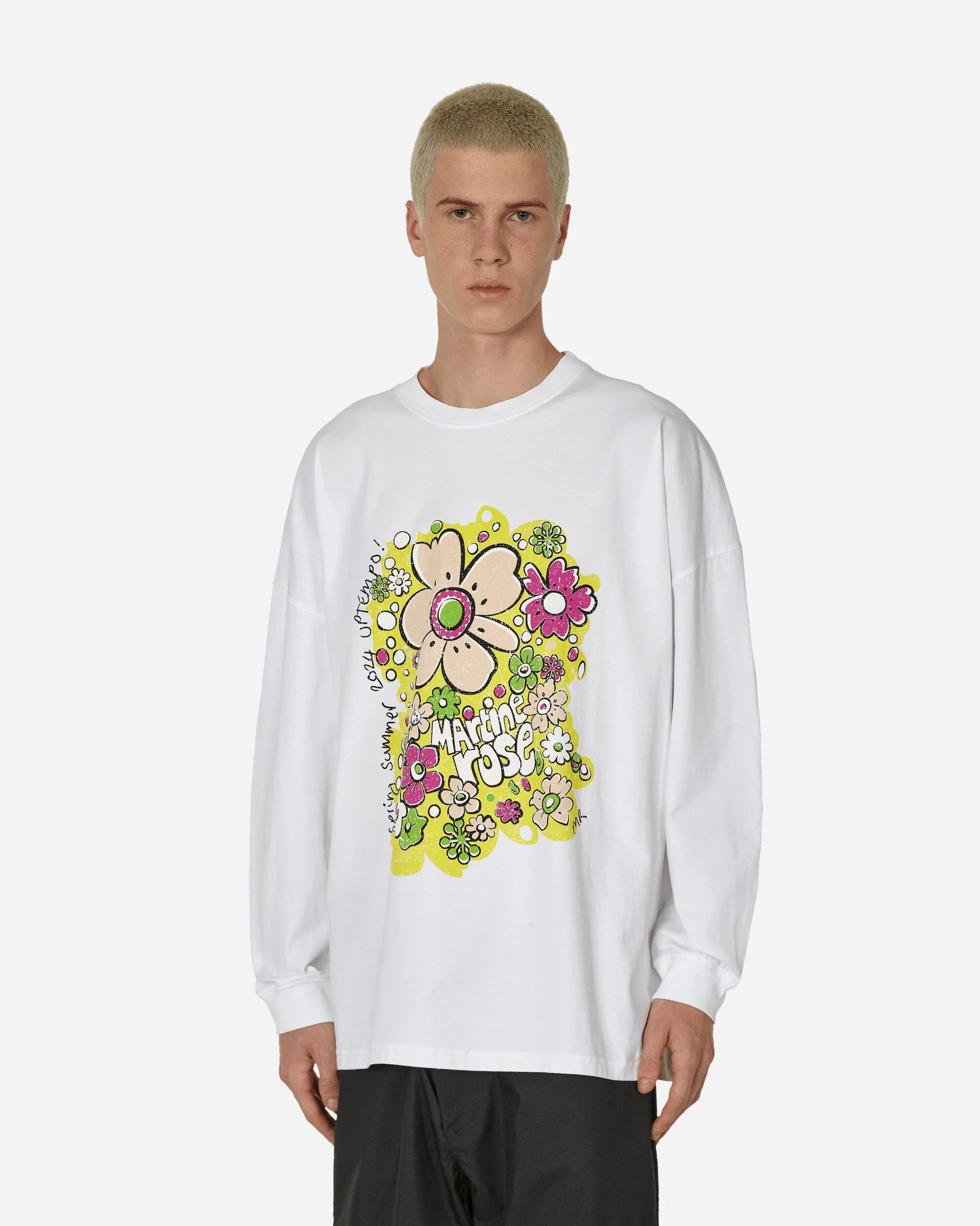 Martine Rose Oversized Longsleeve T-Shirt White / Festival Flower Martine Rose takes an unconventional approach to familiarity by revamping classic menswear pieces with unexpected fabrics, oversized proportions, deconstructed silhouettes and subversive traditional tailoring codes. - 100% Cotton - Oversized Fit - Ribbed Crewneck - Graphic Printed at Front - Style Code: MRSS24-624A WHFEFL SIZE & FIT Model is 6ft 1in/1.83m with 35"/90cm chest and wears size M. Measures (Size M): 72cm Shoulders, 65cm Chest, 49cm Sleeve, 69cm Length, 64cm Hem.