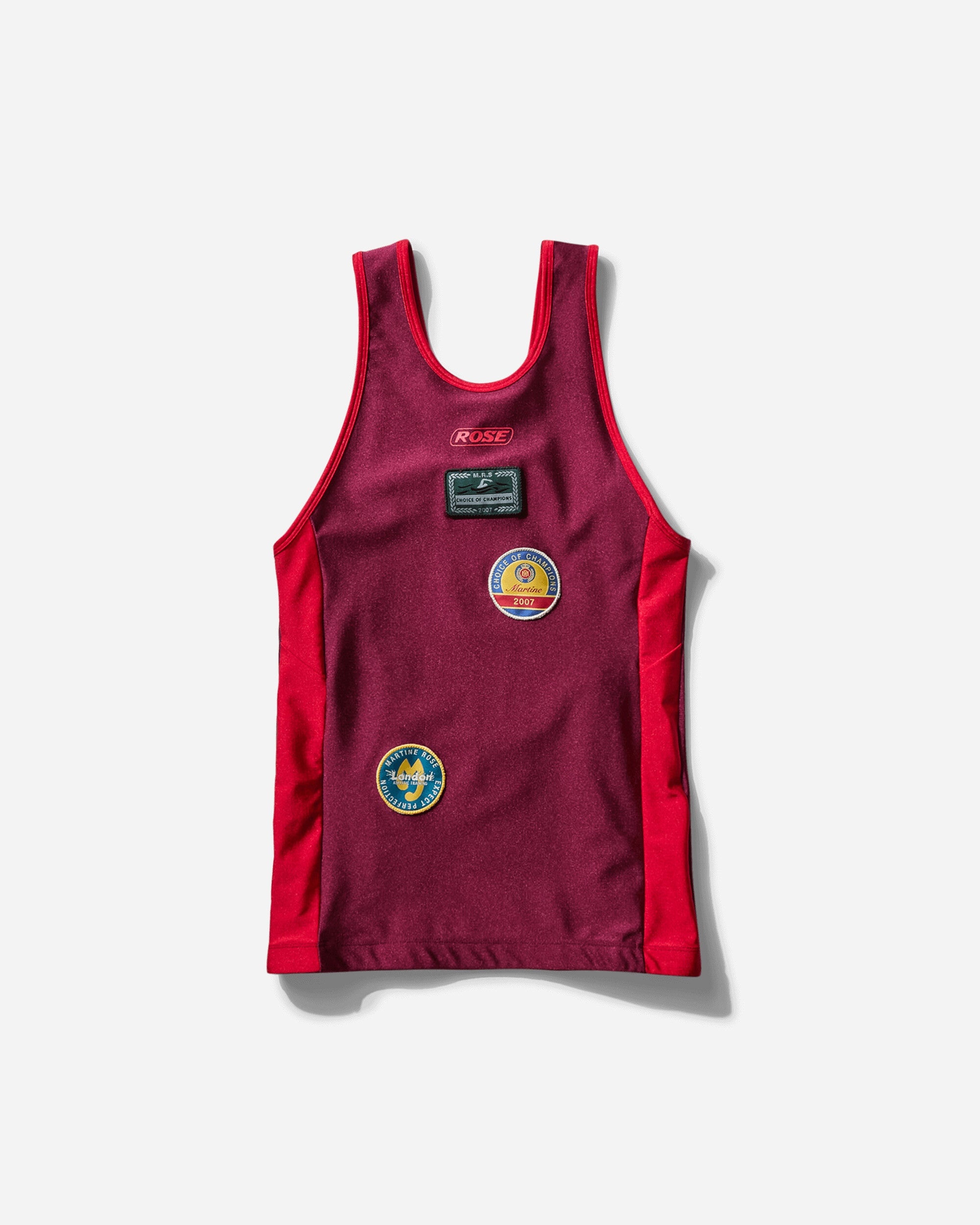 Martine Rose Swim Vest Red / Burgundy Tight fitting swim vest with seasonal appliques badges. featuring a racer back, contrast panelling and binding. - 80% Polyamide, 20% Elastane - Tight Fit - Woven Logo Patches - Racer Back - Contrast Paneling and Binding - Style Code: 661JT06102