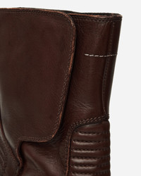 MM6 Maison Margiela Biker Boots Chestnut This mid-calf boot distils vintage motor references into a modern uniform. Constructed in a brown leather-effect finish with ribbed panels and curved topstitching, it hints at performance while remaining firmly aesthetic. At the back, a white stitch line highlights the Maison's signature. - Calf Leather Upper - Leather Effect Finish - Rounded Toe with Layered Panelling - Ribbed Instep and Heel Patch - Exaggerated Collar with Raw Edge - White Stitch Line at Back - Rubber Sole - Made in Italy - Style Code: SH3WU0015 T2187