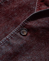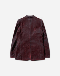 MM6 Maison Margiela Flocked Denim Suit Jacket Bordeaux This single-breasted jacket blends sharp structure with subcultural edge. The denim-effect coating reveals subtle signs of wear, infusing the formality of suiting with a distinctly lived-in finish. Faint fading and contrast topstitching trace its contours, channelling the Maison's irreverent spirit. Finished with the white stitch line at the back. - 98% Cotton, 2% Elastane - Lining: 100% Viscose - Coated Stretch Cotton Denim - Fitted - Notched Lapel Collar - Single-Breasted Button Closure - Two Flap Pockets - Contrast Stitching - White Stitch Line at Back - Made in Italy - Style Code: SH2BN0019 227