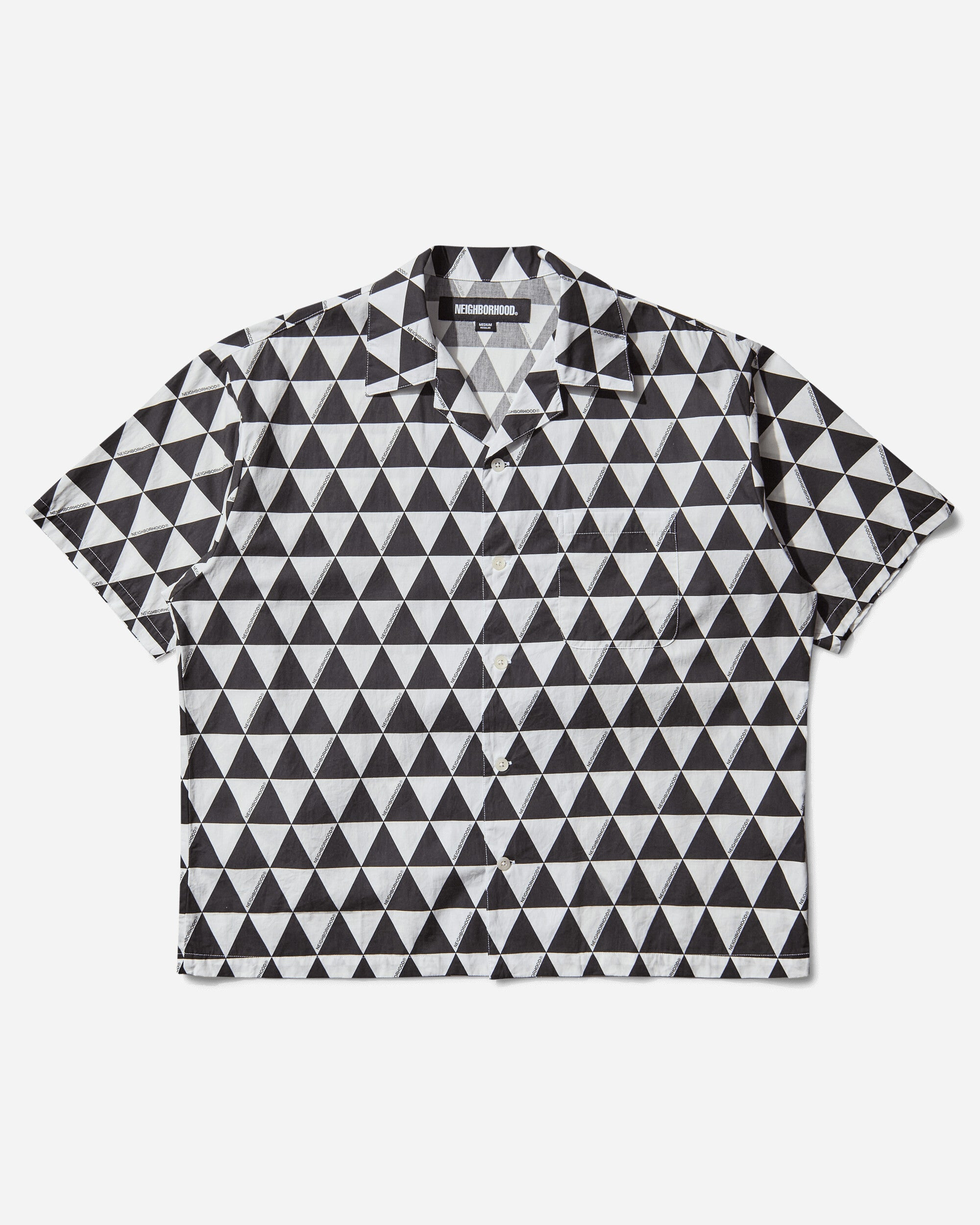 Neighborhood Triangle Pattern Hawaiian Shirt White This Hawaiian shirt features an original triangle pattern and it's made from broadcloth fabric with an open collar and a pin label on the side seam. - 100% Cotton - Regular Fit - Triangle Pattern - Open Collar - Button Closure - Woven Label at Side Seam - Straight Hem - Style Code: 251TSNH-SHM12 WH