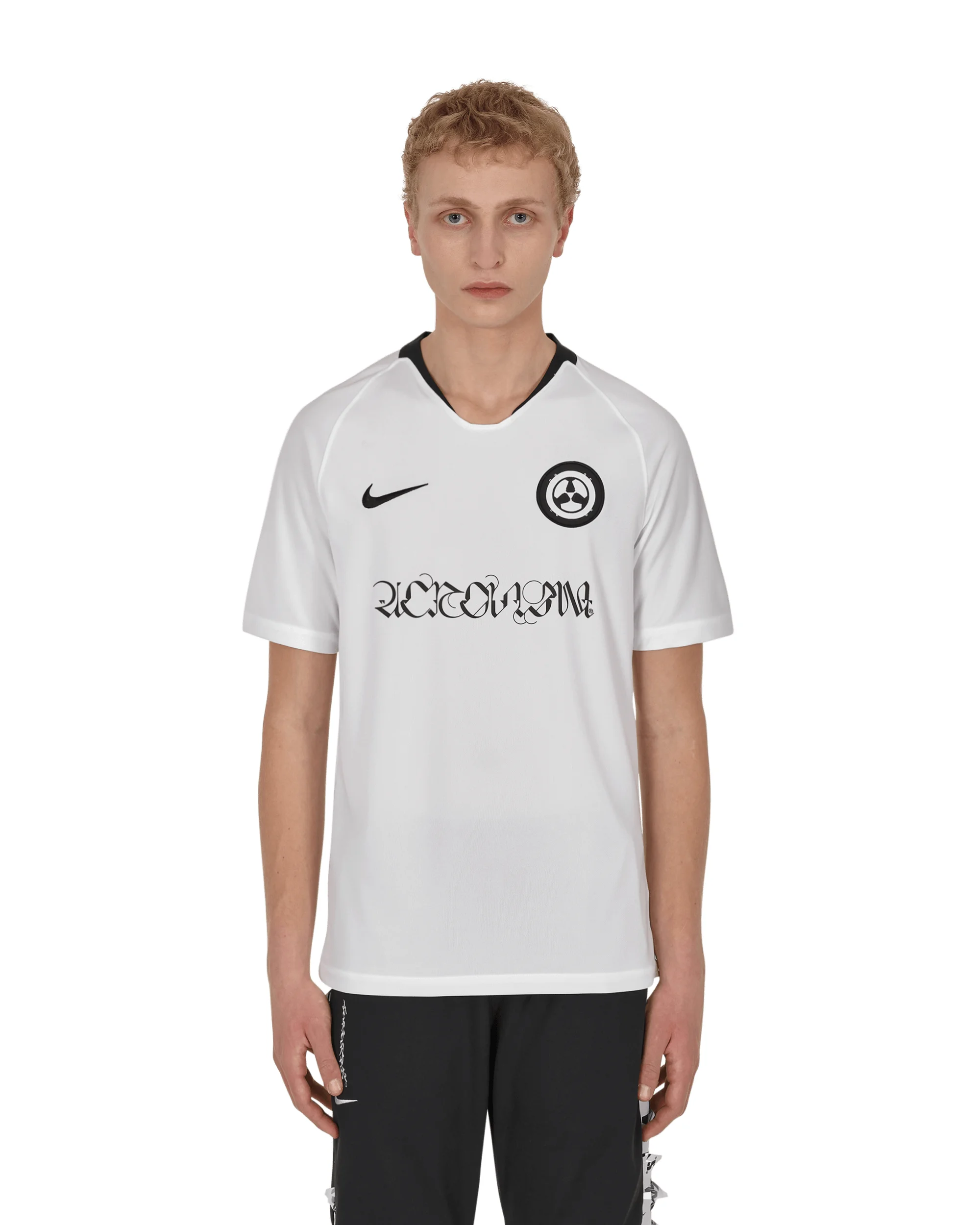 Nike x ACRONYM® Stadium Jersey T-Shirt White Nike and ACRONYM® founder Errolson Hugh continue their long-standing collaborative relationship by coming together for the first-ever Nike & ACRONYM® apparel collection. Featuring custom ACRONYM® graphics and highly functional apparel pieces, Hugh's taken the idea of classic Nike sportswear and infused his own evocative elements into them. - 100% Polyester - Raglan Sleeves - Woven Crest - Embroidered Swoosh at Chest - Silicone Logo Print at Front and Back - Style Code: DC8808-100 SIZE & FIT Model is 6ft 1in/1.86m with 32"/90cm chest and wears size M. Measures (Size M): 50cm Chest, 38cm Sleeve, 72cm Length, 52cm Hem.