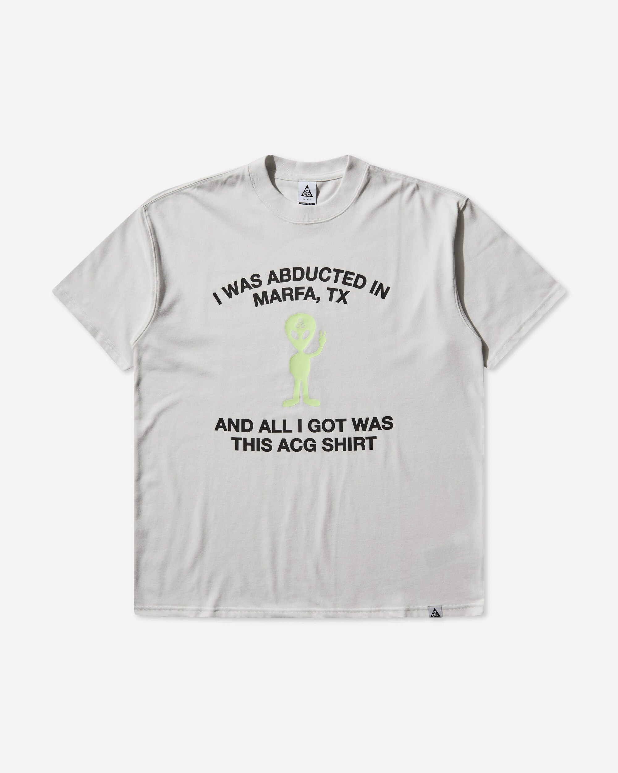 Nike ACG Alien T-Shirt Summit White Aliens or optical illusion? That's the question as you watch mysterious lights fill the sky over Marfa, Texas. Either way, this tee has a loose fit and sweat-wicking fabric to help keep you comfortable. - 63% Polyester, 37% Cotton - Loose Fit - Ribbed Crewneck - Graphic Printed at Front - Style Code: HV2168-121