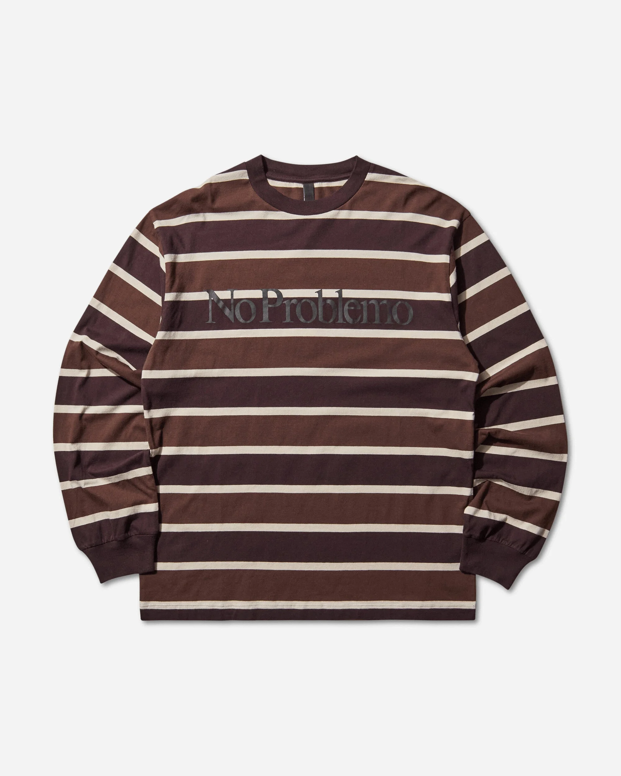 No Problemo Striped Longsleeve T-Shirt Brown No Problemo offers a premium and unisex uniform of workwear, graphic styles and contemporary streetwear staples. Brought to you by Aries, the brand creates trusted fits across genderless silhouettes with attention to detail, quality of production and finish, all made possible through an established and transparent supply chain. - 100% Cotton - Regular Fit - Ribbed Collar and Cuffs - Logo Printed at Front - Style Code: NP6002104 BRW