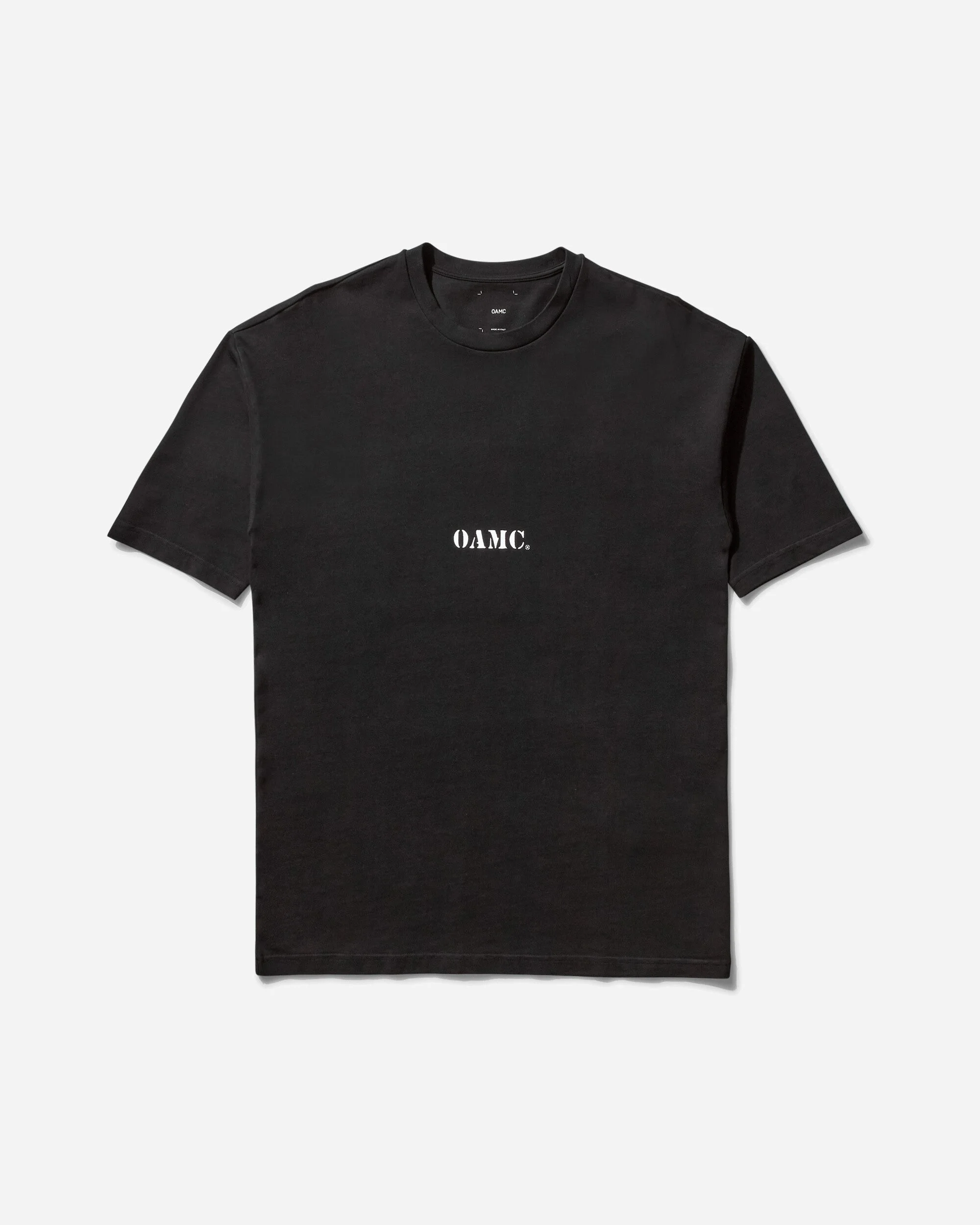 OAMC Horses T-Shirt Black From OAMC "Olden Ages Meeting Current" collection, this loose fit tee made in compact jersey fabric features a cotton screen-printed patch applied on the back. - 100% Cotton - Loose Fit - Ribbed Collar - Logo Printed at Front - Screen-Printed Patch at Back - Made in Italy - Style Code: OA5SMH01APJE501999 999
