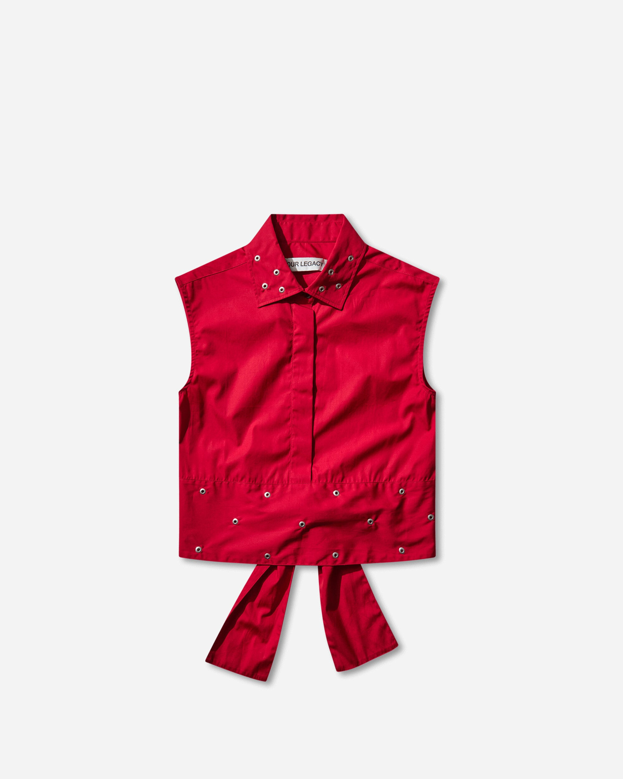 Our Legacy Girdle Top Lipstick Red Produced in cotton poplin fabric, the women's Girdle Top is a sleeveless style with a relaxed fit and features a hidden button placket, cutaway collar, a short yoke on the back with the rest of the back being exposed, and a girdle belt that ties at the back. - 100% Cotton - Super Poplin Fabric - Cutaway Collar - Hidden Button Placket - Girdle Belt Ties at Back - Short Yoke with Exposed Back - Style Code: W4252GLR 001