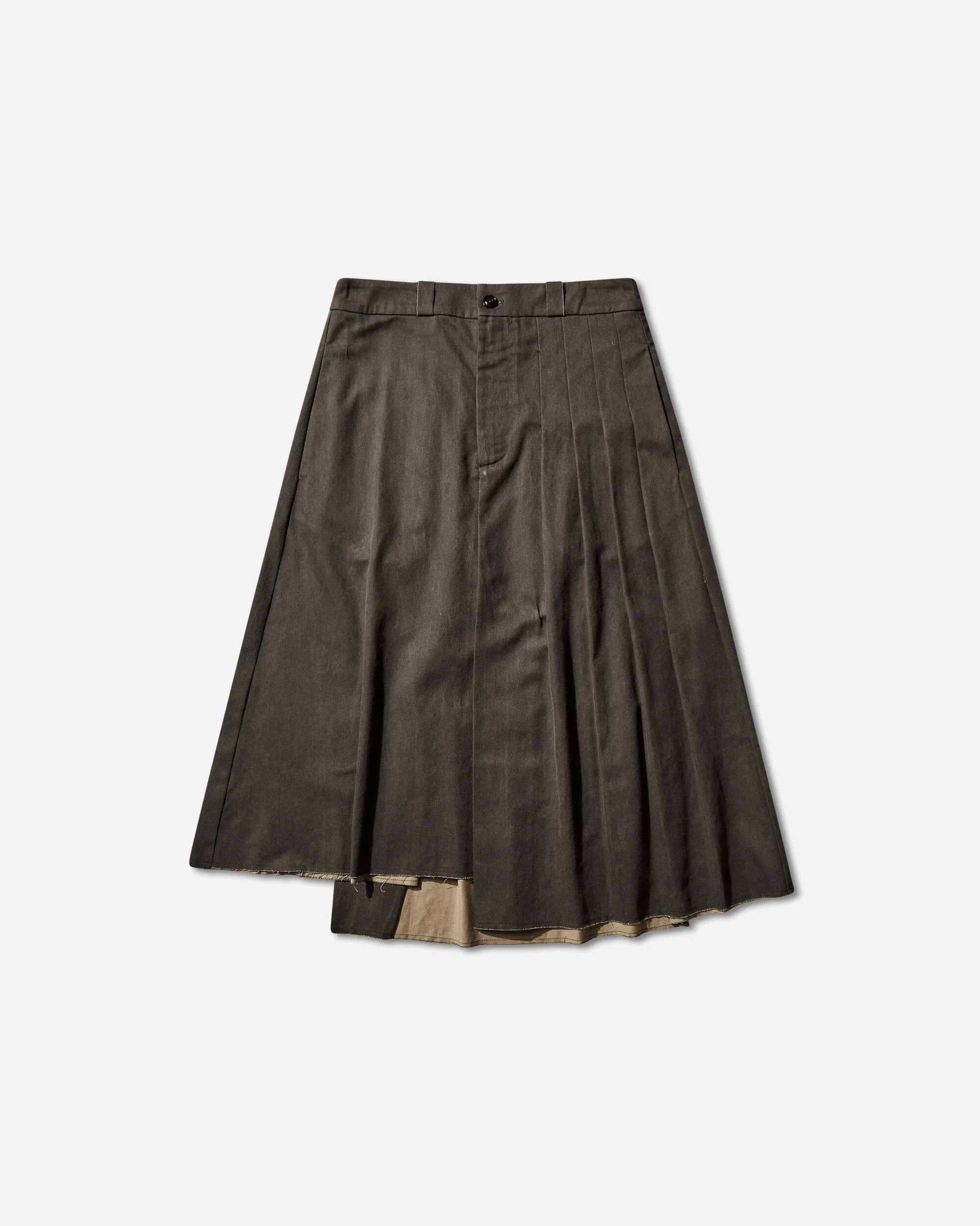 Our Legacy Origami Skirt Antique Mudd Coated Sateen Produced in a Japanese cotton sateen with a pigment-coated finish that lends a muted sheen, the skirt has a clean, minimal A-line silhouette with the left side slightly longer than the right. The Origami Skirt features defined pleats on the left side and back panel, almost no topstitching, a raw hem and belt loop edges with secure topstitching, a zip fly with a buttoned waistband, and a clean bagged-out patch pocket at the right back. - 100% Cotton - Pigment Coated Finish with Muted Sheen - A-Line Silhouette - Asymmetrical Length - Button Closure - Zip-Fly - Pleats at Front and Back - Style Code: W2264OAM