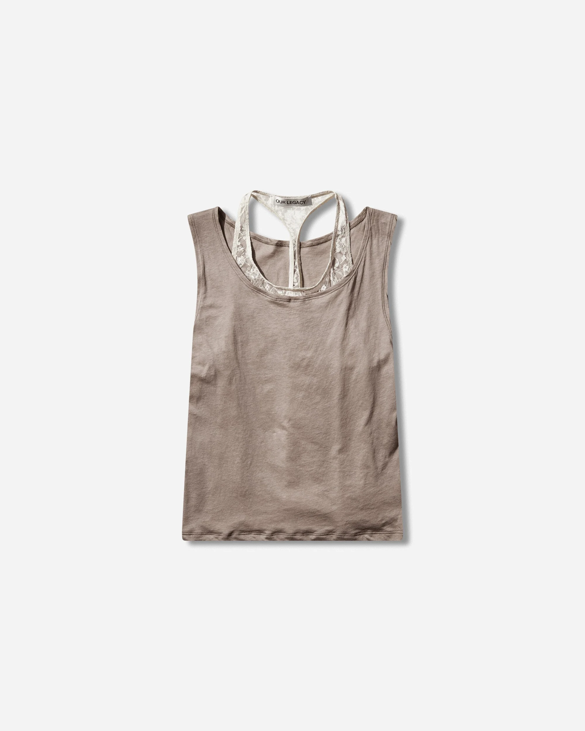 Our Legacy Swim Tank Velvet Sand Airveil Cotton Produced in a Portuguese Airveil cotton fabric, the Swim Tank has a fitted silhouette and features a double-layer construction with a lower front neckline on the outer layer and a classic tank back. The inner layer is crafted in sheer lace with a deep scoop at the back armhole, and the piece is reversible to wear the lace on the outside. - 100% Cotton - Fitted - Double-Layer Construction - Reversible - Inner Layer in Sheer Lace - Deep Scoop at Back Armhole - Style Code: W2266SV