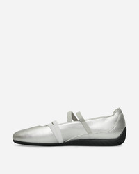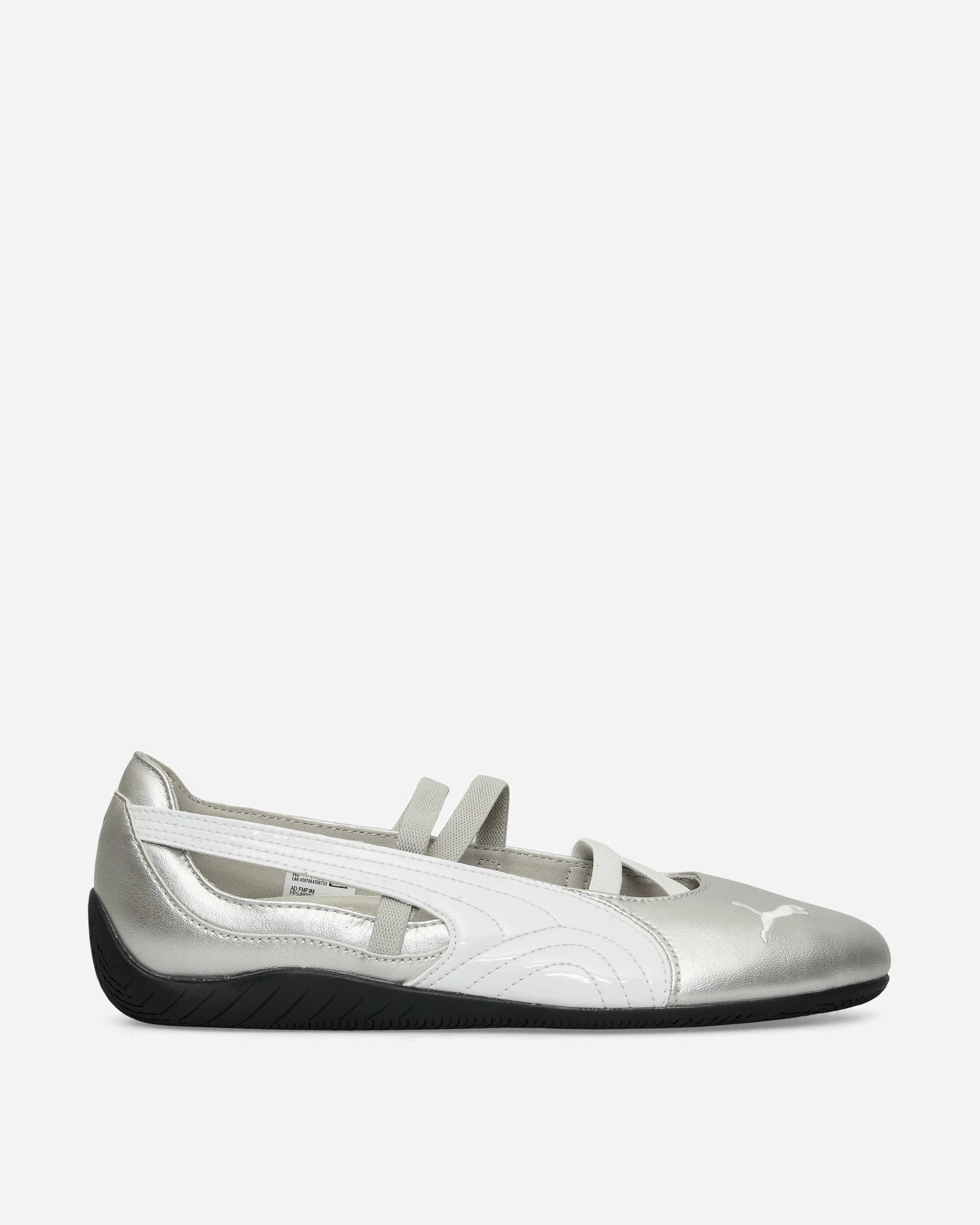 Puma Speedcat Ballet Metallic Shoes Silver / White An icon of racing culture, the PUMA Speedcat has been synonymous with speed, precision, and unparalleled performance for over 25 years. It originated as a fireproof Formula 1® footwear style, but over the decades it found itself on a new circuit – transcending the tracks of Monaco for the streets of global fashion capitals. Merging ballet elegance with that original racing DNA, the Speedcat Ballet features a metallic upper, embroidered PUMA cat, and elastic bands for a snug fit. Embrace the low-profile trend with this iconic PUMA silhouette. - Metallic Leather Upper - Textile Lining - Elastic Strap - Rubber Outsole - Style Code: 401581-01