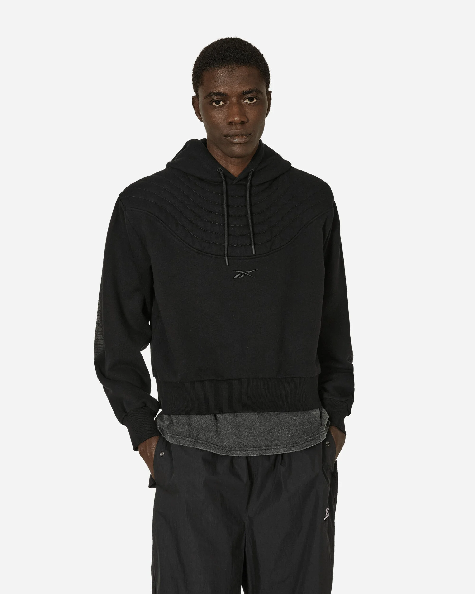Reebok x Machine-A Padded Biker Hoodie Black Reebok and Machine-A present their exclusive collaboration, paying respect to and celebrating the LGBTQIA+ community with a focus on the delicate threads of gender neutrality. The MACHINE-A x Reebok LTD collection aims to promote inclusion and empower individuals within the diverse spectrum of love. - 100% Cotton - Cropped Fit - Waffle Panels - Drawstring Hood - Padded Shoulders - Embriudered Branding - Kangaroo Pocket - Rubbed Cuffs and Hem - Style Code: RMBB005C99FLE001 SIZE & FIT Model is 6ft 2in/1.89m with 38"/95cm chest and wears size L.