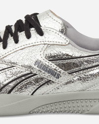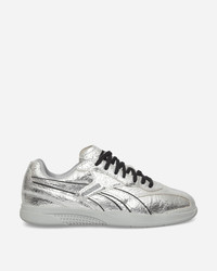 Reebok Pleasures Hammer Street Sneakers Silver / Grey Rooted in Reebok’s ‘90s indoor soccer archives and reimagined in collaboration with PLEASURES, these shoes channel the grunge and punk aesthetic the LA-based streetwear label is known for. They feature a silver crinkled leather upper with black leather accents, finished with custom branding on the window, tongue, and footbed. - Silver Crinkled Leather Upper - Textile Lining - Custom Branding Window, Tongue and Footbed - Rubber Outsole - Style Code: 100238498 498